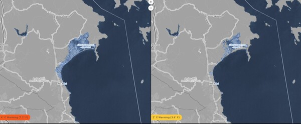 Η περιήγηση στον παραπάνω χάρτη δείχνει τι θα συμβεί σε παραθαλάσσιες περιοχές της Αττικής, αλλά και όλης της Ελλάδας αν η θερμοκρασία ανέβει κατά 4 βαθμούς ( αριστερά) και αν ανέβει 2 βαθμούς ( δεξιά).