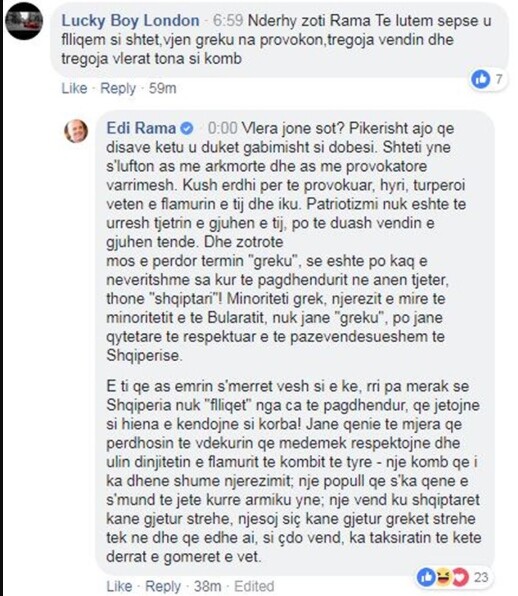 Για «προβοκάτορες κηδειών» έκανε λόγο ο πρωθυπουργός της Αλβανίας Έντι Ράμα, απαντώντας σε σχόλιο συμπατριώτη του στο Facebook που του ζήτησε να παρέμβει για όσα έγιναν στην κηδεία του Κωνσταντίνου Κατσίφα.