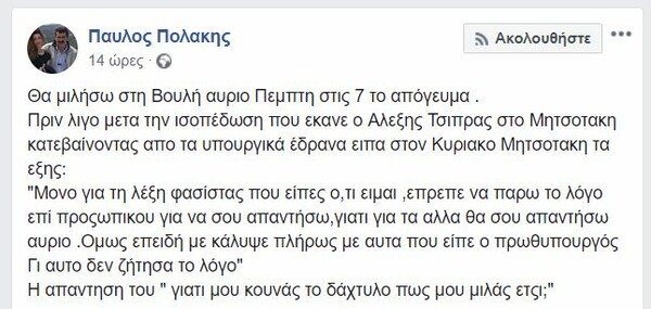 Σε κάποιο σημείο, ο Παύλος Πολάκης προσέγγισε και τα έδρανα της ΝΔ, απευθύνοντας τον λόγο στον κ. Μητσοτάκη. Το τετ α τετ το έπιασε τόσο ο τηλεοπτικός φακός όσο και οι φωτογράφοι. Μετά την έντονη φημολογία για τη στιχομυθία των δύο ανδρών, ο αναπληρωτής υπουργός Υγείας, έγραψε στον προσωπικό του λογαριασμό στο Facebook τι, κατά τον ίδιο, συνέβη: «Θα μιλήσω στη Βουλή αύριο, Πέμπτη στις 7 το απόγευμα. Πριν λίγο, μετά την ισοπέδωση που έκανε ο Αλέξης Τσίπρας στον Μητσοτάκη, κατεβαίνοντας από τα υπουργικά έδρανα είπα στον Κυριάκο Μητσοτάκη τα εξής: "Μόνο για τη λέξη φασίστας που είπες ο,τι είμαι, έπρεπε να πάρω τον λόγο επί προσωπικού για να σου απαντήσω, γιατί για τα άλλα θα σου απαντήσω αύριο. Όμως επειδή με κάλυψε πλήρως με αυτά που είπε ο πρωθυπουργός. Γι' αυτό δεν ζήτησα το λόγο". Η απάντηση του "γιατί μου κουνάς το δάχτυλο; Πως μου μιλάς έτσι;"»