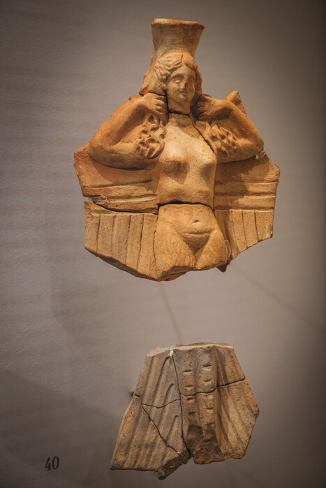 Πήλινο σκεύος σε μορφή ειδωλίου Σειρήνας, 2ος – 1ος αι. π.Χ. Πρόκειται για τελετουργικό σκεύος, δημιουργία τοπικού εργαστηρίου. Βρέθηκε σε επίχωση εναγικής πυράς κοντά σε τάφους ελληνιστικών χρόνων. Η αφήγηση στην ντόπια κοροπλαστική του μυθικού στιγμιοτύπου της θρηνώδους Σειρήνας υποδηλώνει ότι ένας από τους ιδρυτικούς μύθους της Απτέρας μορφοποιήθηκε σε αυτήν τη φάση της πόλης. Φωτο: Γιώργος Αναστασάκης © Μουσείο Κυκλαδικής Τέχνης