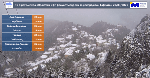 Σύμφωνα με το δίκτυο των αυτόματων μετεωρολογικών σταθμών του Εθνικού Αστεροσκοπείου Αθηνών/Meteo.gr, το μεγαλύτερο ύψος βροχής έως τις 15:00 το μεσημέρι του Σαββάτου, καταγραφόταν στην Αγιά Λάρισας με 39 χιλιοστά μέσα σε χρονικό διάστημα περίπου 12 ωρών. Παράλληλα, πυκνές χιονοπτώσεις εκδηλώνονται στα κεντρικά και βόρεια ορεινά τμήματα. Για την Κυριακή προβλέπονται βροχές και τοπικές καταιγίδες στα δυτικά, κεντρικά και βόρεια, καθώς και στα νησιά του Βορειοανατολικού Αιγαίου.
