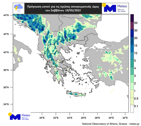 Ιδιαίτερα το Σάββατο 14/05 πιθανότητα τοπικών βροχών και ενδεχομένως καταιγίδων υπάρχει και για τις πόλεις της Αθήνας και Θεσσαλονίκης, ενώ τοπικές βροχές και καταιγίδες αναμένονται και στην Κρήτη.