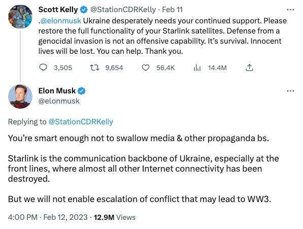 Ο Έλον Μασκ επιβεβαίωσε πως περιορίζει χρήση της δορυφορικής διαδικτυακής υπηρεσίας Starlink από τον στρατό της Ουκρανίας, φοβούμενος πως μπορεί να χρησιμοποιηθεί κατά τρόπο που θα οδηγήσει «σε κλιμάκωση» και, τελικώς, στον Γ' Παγκόσμιο Πόλεμο.