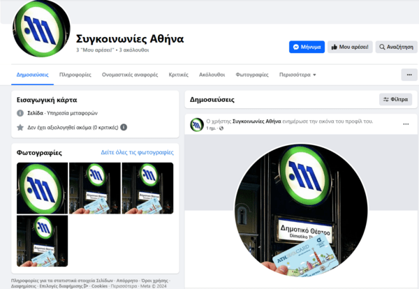 Η σελίδα ονομάζεται «Συγκοινωνίες Αθήνα» και υποτίθεται πως εκπροσωπεί τον ΟΑΣΑ. Σε αναρτήσεις της διαφημίζει πως δήθεν με αφορμή τα 45 χρόνια λειτουργίας του, ο ΟΑΣΑ (τον οποίο αναφέρει ως «η ΟΑΣΑ») μοιράζει δωρεάν κάρτες μετακινήσεων για έναν χρόνο - σε μια «προσφορά» που υποτίθεται πως ισχύει για πέντε ημέρες μόνο.