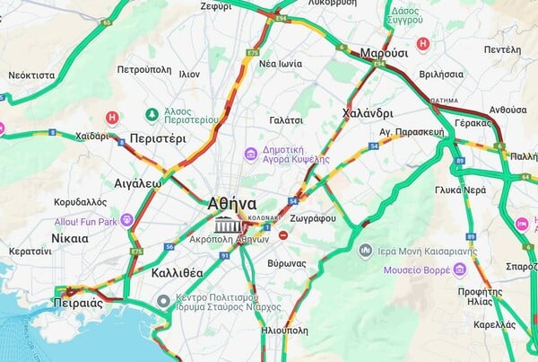 Σύμφωνα με το Google Maps, η κίνηση είναι ιδιαίτερα αυξημένη σε όλο το λεκανοπέδιο. Αναλυτικότερα, «στο κόκκινο» βρίσκονται η λεωφόρος Κηφισίας, η Βασιλίσσης Σοφίας, οι δρόμοι στο κέντρο του Πειραιά, της Νέας Ερυθραίας, η λεωφόρος Αθηνών στο Χαϊδάρι, η Κατεχάκη και το κέντρο της Αθήνας.