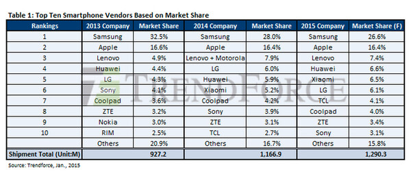 Τα δεδομένα της TrendForce παρέχουν μια αντιπροσωπευτική ματιά στην ταχέως αναπτυσσόμενη βιομηχανία των smartphones. Σύμφωνα με τις μετρήσεις της, οι παγκόσμιες πωλήσεις συσκευών ανήλθαν σε 1,2 δισεκατομμύρια το 2014, σε σχέση με τα 927,2 εκατομμύρια κομμάτια που πουλήθηκαν το 2013 και ο ανταγωνισμός για τη Samsung αυξάνεται συνεχώς καθιστώντας ολοένα και δυσκολότερη τη διατήρηση του "θρόνου" της. Ειδικά σε αγορές-κλειδιά, όπως η Κίνα, οι ανταγωνιστές (Lenovo, Huawei και Xiaomi) κερδίζουν συνεχώς έδαφος.