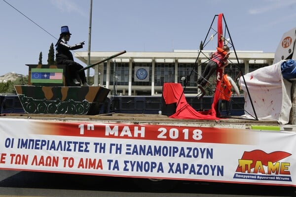 Την πορεία των διαδηλωτών συνόδευσαν τα άρματα που κατασκεύασαν με μηνύματα κατά του πολέμου, των πλειστηριασμών και υπέρ της επαναφοράς των συλλογικών συμβάσεων εργασίας.