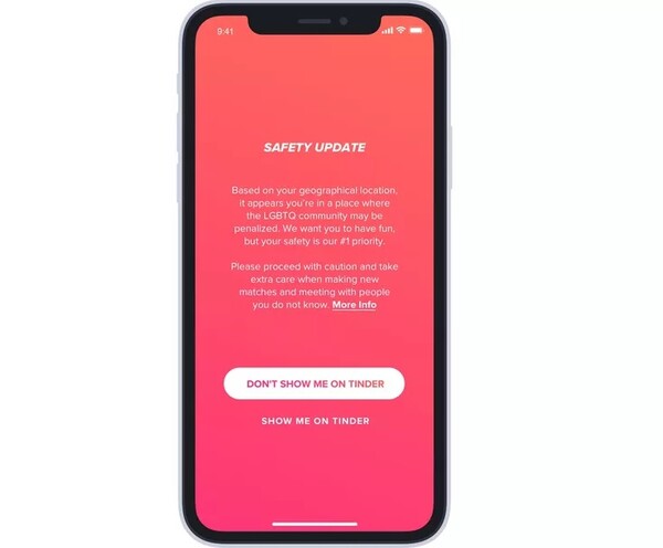 Το Tinder θέλοντας να προστατεύσει τους χρήστες του θα τους ενημερώνει πλέον όταν βρίσκονται σε κάποια από τις 70 χώρες του κόσμου όπου οι ομοφυλόφιλοι αντιμετωπίζουν ποινικές κυρώσεις.