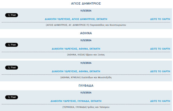 Διακοπές νερού θα σημειωθούν σήμερα σε έξι περιοχές της Αττικής, σύμφωνα με την ανακοίνωση της ΕΥΔΑΠ.