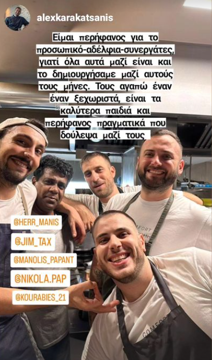 Υπογράφει το σχετικό του μήνυμα ως εξής: «Αλέξανδρος Καρακατσάνης, περήφανος σεφ και ιδιοκτήτης του εστιατορίου Monk’s Beard».