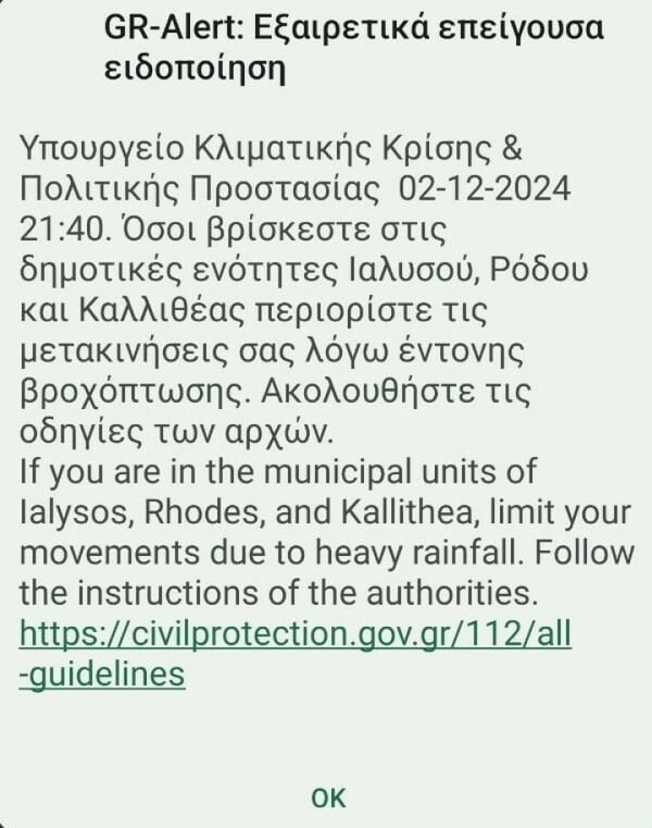 Στις 21:40 ενεργοποιήθηκε εκ νέου ο αριθμός έκτακτης ανάγκης 112, μέσω του οποίου εστάλη μήνυμα στους κατοίκους των δημοτικών ενοτήτων Ιαλυσού, Ρόδου και Καλλιθέας. Το μήνυμα καλεί τους πολίτες να περιορίσουν τις μετακινήσεις τους για λόγους ασφαλείας, καθώς τα φαινόμενα παραμένουν ιδιαίτερα έντονα.