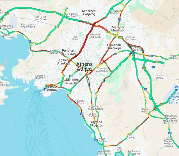 Με πολλά προβλήματα και μεγάλες καθυστερήσεις διεξάγεται η κίνηση στον Κηφισό και στα δύο ρεύματα, από Ταύρο μέχρι Κάτω Κηφισιά στην άνοδο και στην κάθοδο από Αττική οδό μέχρι Ρέντη. Προβλήματα στην κίνηση παρουσιάζονται και στην Αττική οδό, με μεγάλες καθυστερήσεις 15΄-20΄στην έξοδο για Λαμία προς Αεροδρόμιο, 25΄-30΄από Φυλής έως Κηφισίας προς Αεροδρόμιο, άνω των 30΄από Ανθούσα έως Μεταμόρφωση (έξοδος για Λαμία) προς Ελευσίνα, 20΄-25΄ από Αγία Παρασκευή έως Κηφισίας προς Ελευσίνα.