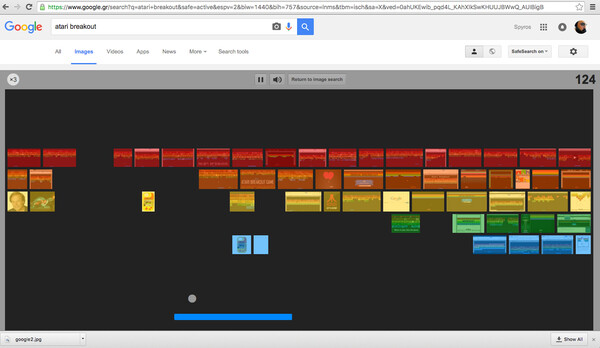 Πληκτρολογούμε "atari breakout" και στη συνέχεια πατάμε στην "αναζήτηση εικόνων" (ή image search). Απολαμβάνουμε ένα videogame-κλώνο του κλασικού παιχνιδιού της Atari που χρησιμοποιεί τις φωτογραφίες ως τείχος που πρέπει να σπάσετε με μια μπάλα, στέλνοντάς την τα σωστά σημεία με την ρακέτα.