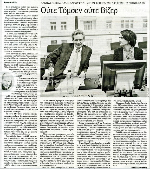 Aνοιχτή επιστολή που δημοσιεύει η «Εφημερίδα των Συντακτών», έστειλε στον πρωθυπουργό ο Αλέξη Τσίπρα μετά τις αποκαλύψεις των WikiLeaks ο πρώην Υποικ.  Γιάνης Βαρουφάκης.