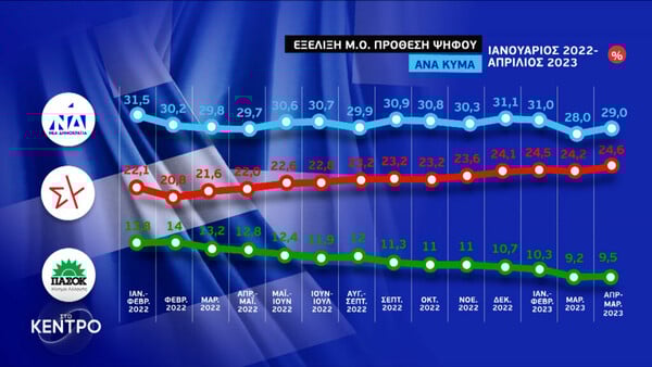 Με βάση αυτά τα στοιχεία, η Νέα Δημοκρατία συγκεντρώνει κατά μέσο όρο 29% στην πρόθεση ψήφου, έναντι 24,6% του ΣΥΡΙΖΑ.