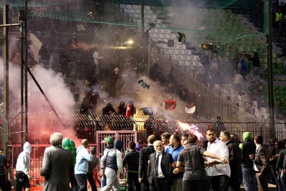 Τα επεισόδια ξεκίνησαν με ανταλλαγή φωτοβολίδων και εξελίχθηκαν σε καρεκλοπόλεμο, με τους οπαδούς να εισέρχονται στο γήπεδο και τα ΜΑΤ να ακολουθούν.