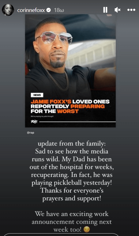 Η Κορίν απάντησε μέσω Instagram την Παρασκευή στις πολυάριθμες αναφορές που υποστήριζαν ότι οι οικείοι του Τζέιμι Φοξ προετοιμάζονταν για τα χειρότερα.