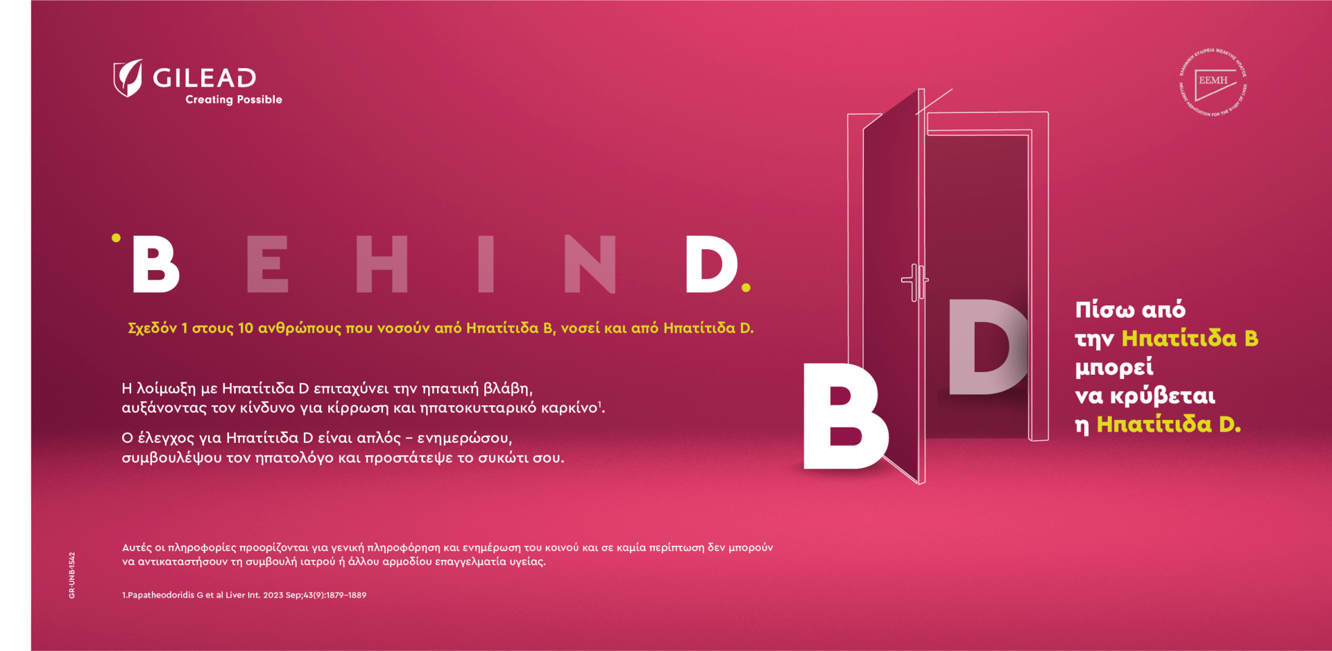 Πίσω από τη διάγνωση της Ηπατίτιδας Β μπορεί να κρύβεται η σοβαρότερη μορφή ιογενούς ηπατίτιδας: η Ηπατίτιδα D (HDV). Παρά τη βαρύτητά της, συχνά παραμένει αδιάγνωστη, καθώς εξελίσσεται σιωπηλά, επιβαρύνοντας σημαντικά την υγεία του ήπατος. Με στόχο να αναδείξει αυτή την «αόρατη» απειλή, η Gilead Sciences Ελλάδος, σε συνεργασία με την Ελληνική Εταιρεία Μελέτης Ήπατος (Ε.Ε.Μ.Η.), υλοποιεί την καμπάνια ενημέρωσης BehinD – Πίσω από την Ηπατίτιδα Β μπορεί να κρύβεται η Ηπατίτιδα D.