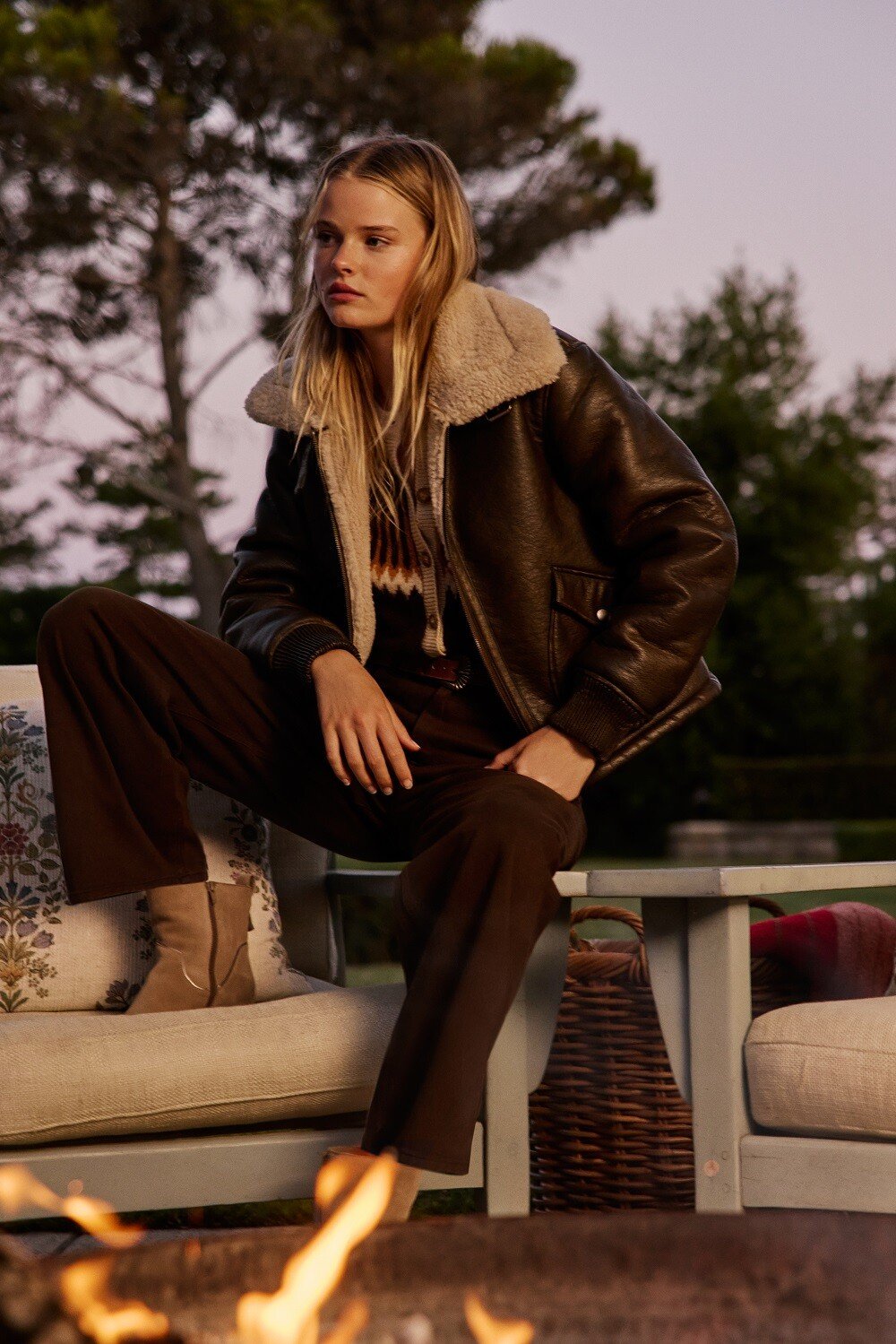 Για τη γυναίκα, οι αποχρώσεις των βρετανικών ακτών —μπλε, αμμώδεις τόνοι και κίτρινες πινελιές— δίνουν τη θέση τους σε βαθιά κόκκινα, earthy ροζ και καφέ, μέσα από prints, πλεκτά και puffers με college επιρροές και μοντέρνα urban αισθητική.