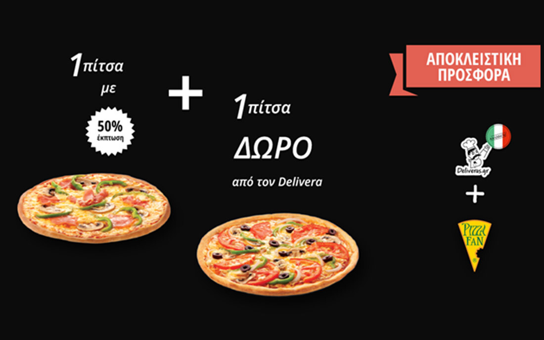 Μέσω του deliveras.gr παίρνεις μία pizza fan με έκπτωση -50% και άλλη μία δώρο από τον delivera!