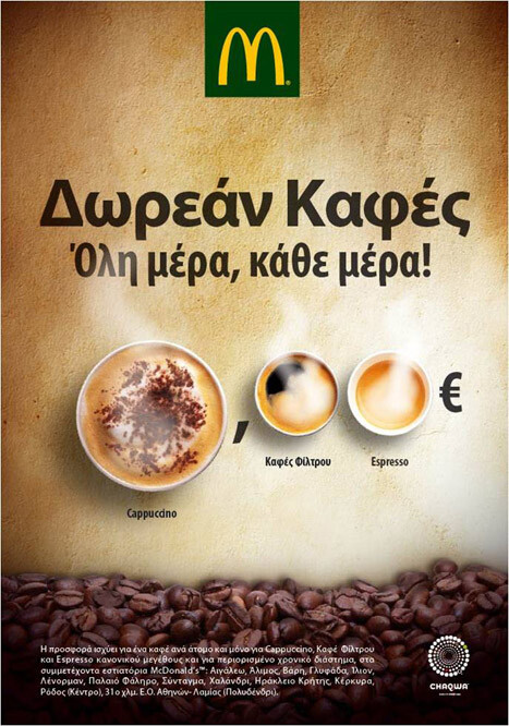 Η Mc Donald’s, συνεπής στην υπόσχεσή της να βρίσκεται δίπλα στους καταναλωτές, προσφέρει εντελώς δωρεάνμία κούπα καφέ φίλτρου, espresso ή cappuccino κανονικού μεγέθους σε όλους τους επισκέπτες καθ’ όλη τη διάρκεια της ημέρας, χωρίς την προϋπόθεση πραγματοποίησης κάποιας άλλης αγοράς. Παράλληλα, τα Mc Donald’s σε μία προσπάθεια να προσφέρουν την καλύτερη δυνατή εμπειρία στους καταναλωτές αναβαθμίζουν συνεχώς τις υπηρεσίες και την εξυπηρέτηση στα εστιατόριά τους, προσφέροντας τη δυνατότητα στους καταναλωτές να απολαμβάνουν τον αγαπημένο τους καφέ ή σνακ σε ένα ευχάριστο και χαλαρωτικό περιβάλλον, να σερφάρουν ξέγνοιαστα στο Internet ή να χρησιμοποιήσουν την μοναδική υπηρεσία drive thru.