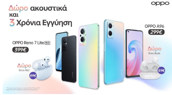 • OPPO A96 στα 299,90€ με δώρο ασύρματα ακουστικά OPPO Enco Buds αξίας 59,90€ και 3 χρόνια εγγύηση