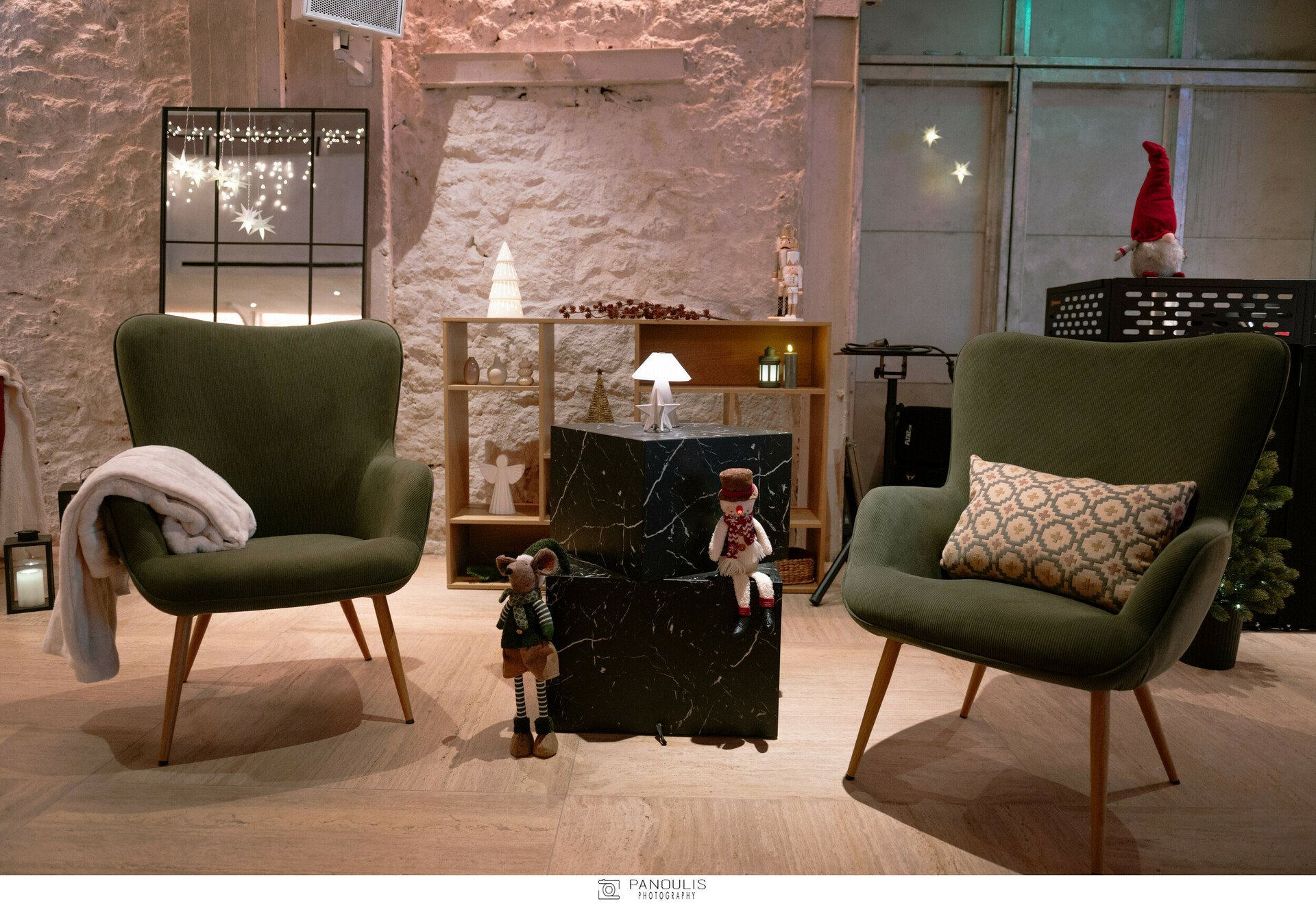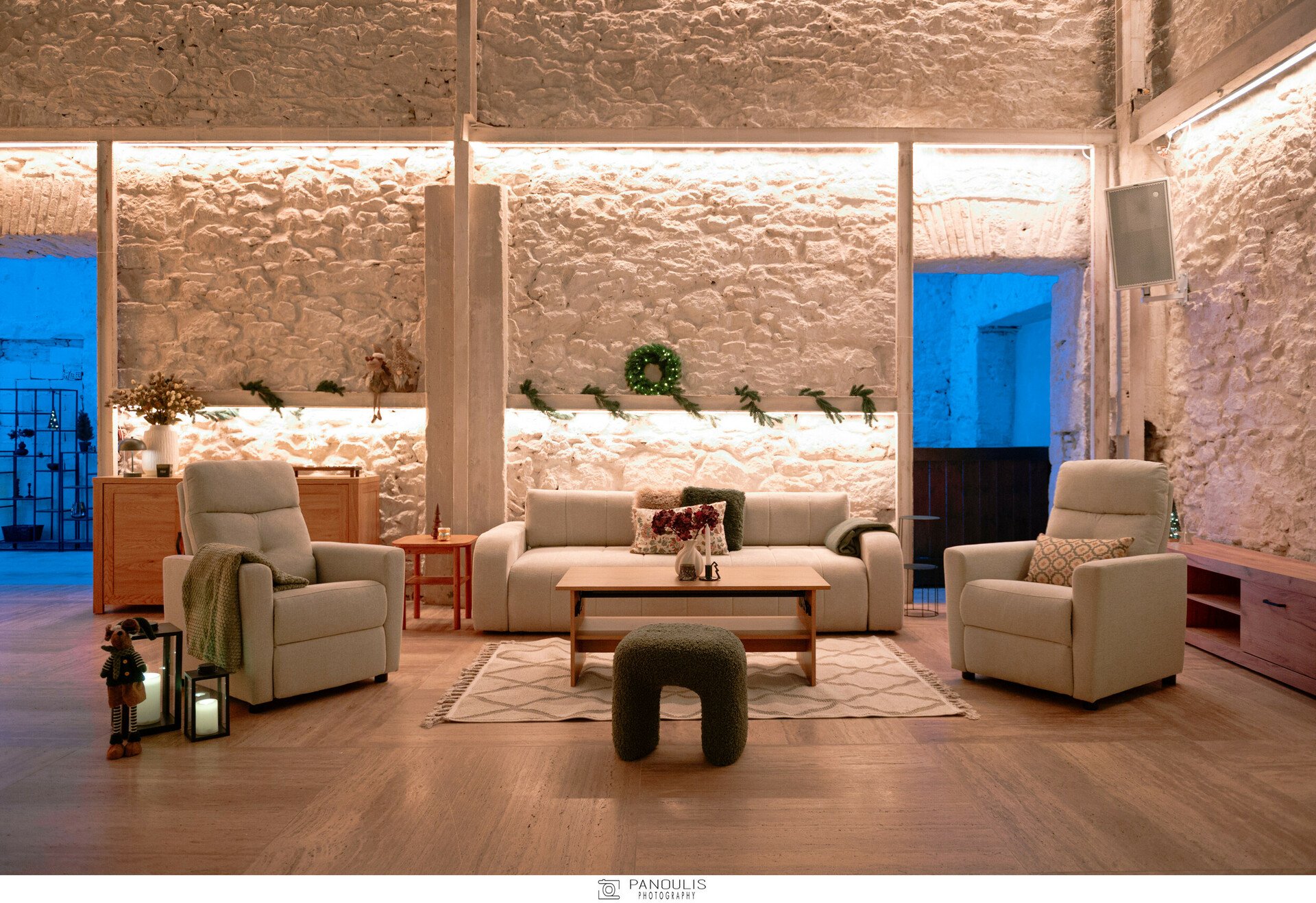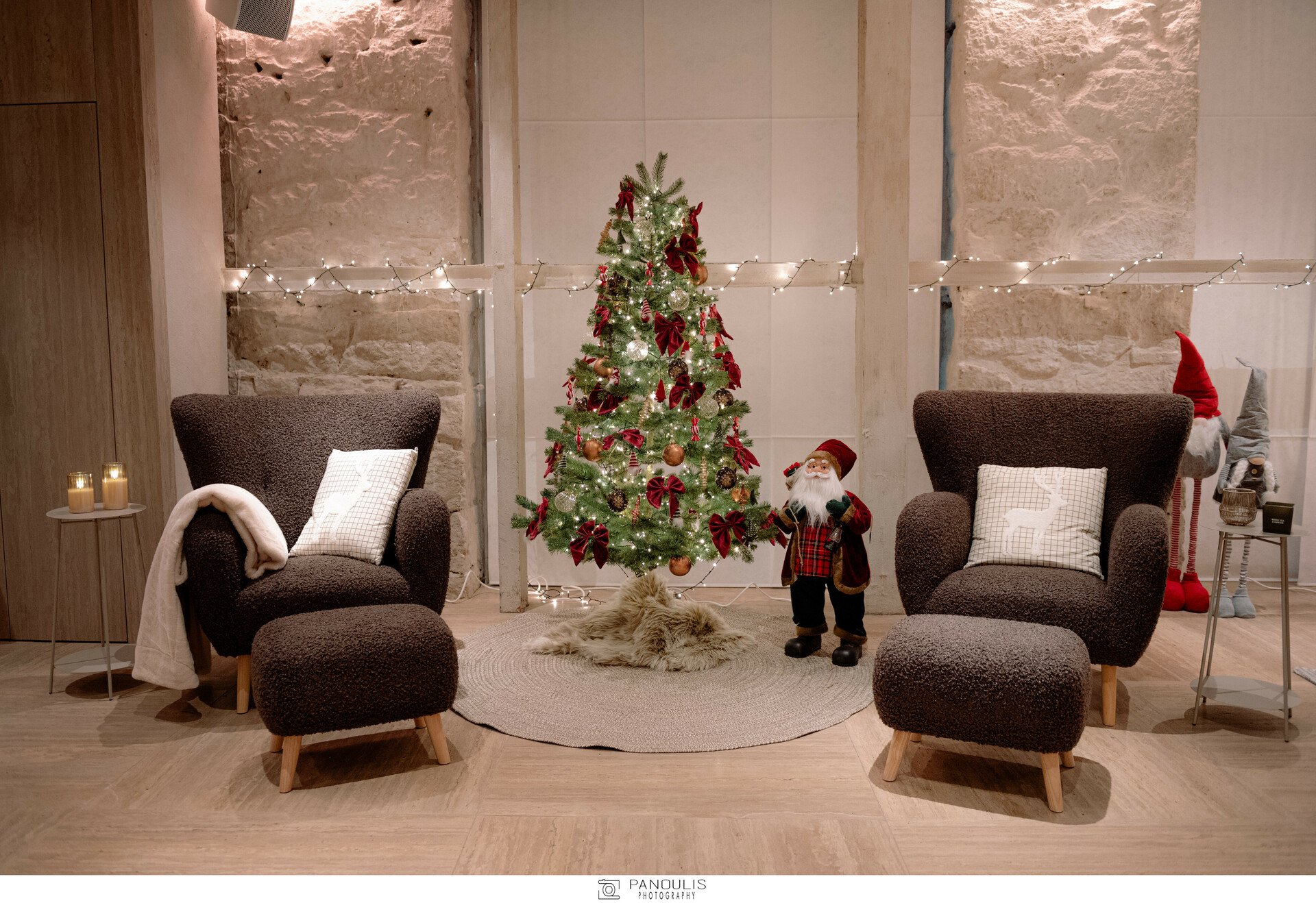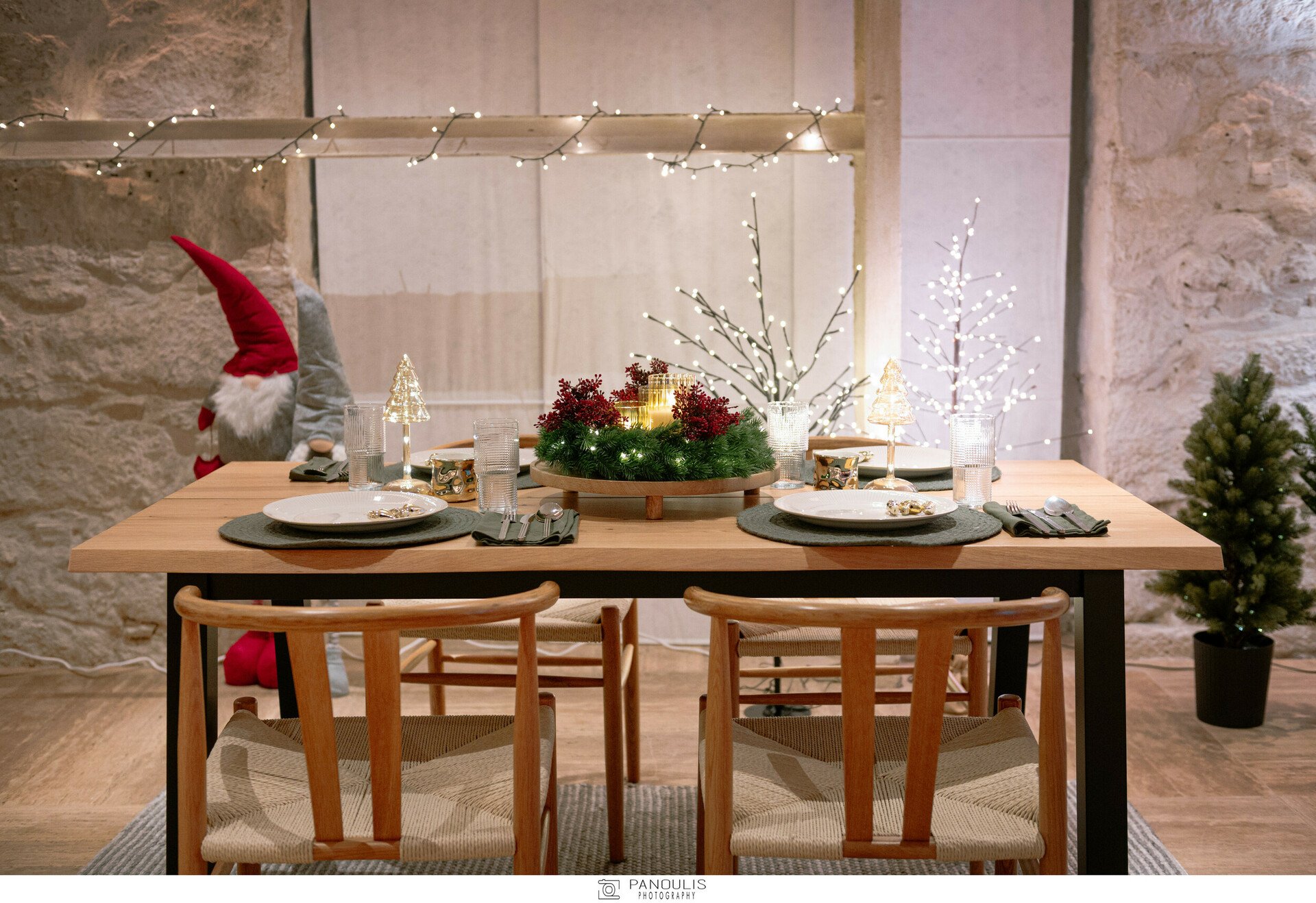 Οι εξειδικευμένες λύσεις φωτισμού, προερχόμενες από φωτεινές γιρλάντες, λαμπάκια, διακοσμητικά με φωτάκια LED, φαναράκια και κεριά από τη γκάμα της JYSKέδεσαν ιδανικά με τον προσεγμένο φωτισμό του χώρου ώστε να δημιουργηθούν δύο διακριτοί,μαγικοί κόσμοι, ο θερμός κόσμος της κύριας σάλας και ο ψυχρός χώρος του αιθρίου.