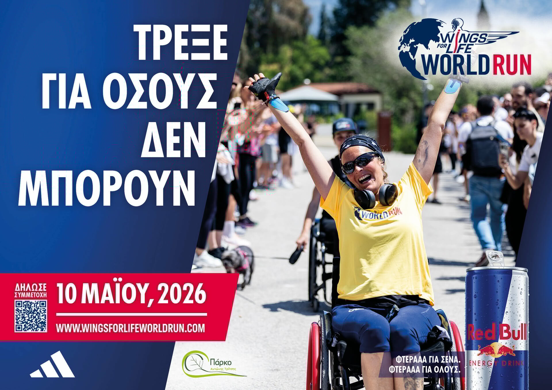 Την Κυριακή 10 Μαΐου 2026, φόρα τα αθλητικά σου και γίνε μέρος της πιο δυνατής παγκόσμιας δρομικής εμπειρίας, το Wings for Life World Run. Ένας αγώνας με πραγματικό νόημα, όπου τρέχουμε για όσους δεν μπορούν. Στην Αττική, το Μητροπολιτικό Πάρκο «Αντώνης Τρίτσης» γίνεται το σημείο συνάντησης, με μία κυκλική διαδρομή 1,8 χλμ. που θα γεμίσει ενέργεια, παλμό και χαμόγελα.