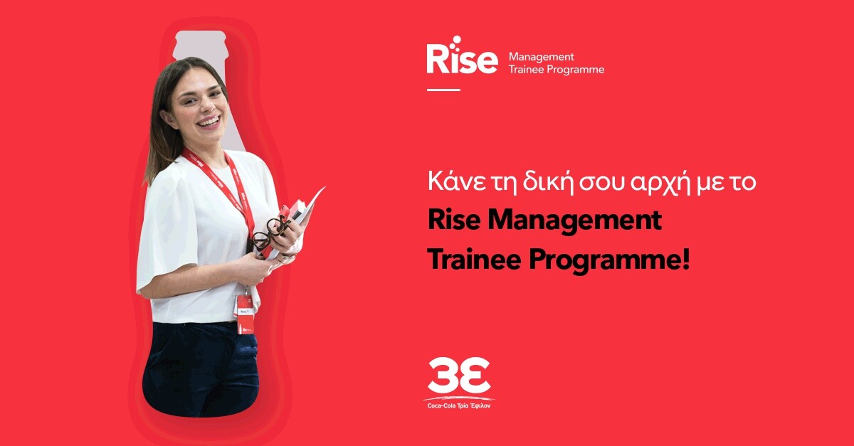 Είναι το RISE Management Trainee, ένα πρόγραμμα 29 ετών της Coca-Cola Τρία Έψιλον που δίνει τη δυνατότητα σε νέους με ταλέντο και διάθεση να κάνουν μία δυναμική επαγγελματική αρχή σε ένα εργασιακό περιβάλλον που τους εξελίσσει κάθε μέρα.