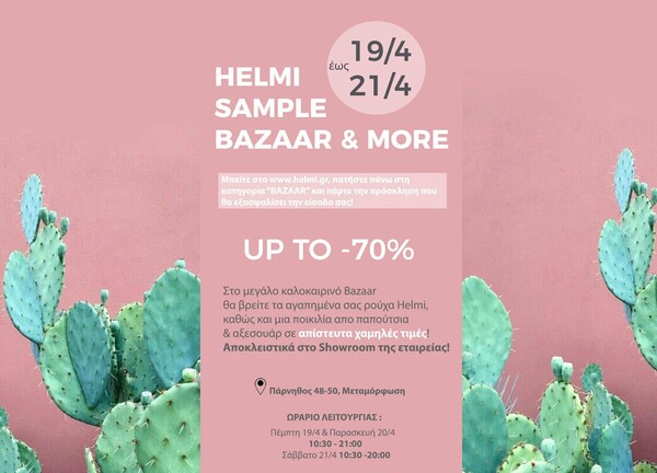Έχοντας καταργήσει όλα τα outlet καταστήματα της, η Helmi μας δίνει μια μοναδική ευκαιρία να βρούμε στο bazaar όλα τα αγαπημένα μας ρούχα καθώς και μια μεγάλη ποικιλία από αξεσουάρ και παπούτσια σε απίστευτα χαμηλές τιμές.