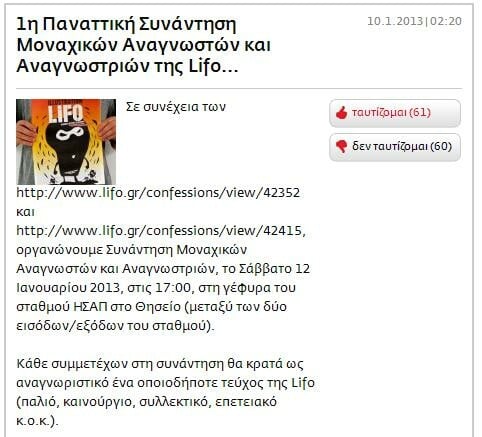 Απαραίτητη προϋπόθεση να συγκεντρωθούν τουλάχιστον 50 "Ταυτίζομαι"-συμμετοχές, αλλιώς η συνάντηση θα ακυρωνόταν για να επανακαθοριστεί σε νέα ημερομηνία, ώρα, χώρο, κατόπιν διεξαγωγής δημοψηφίσματος μεταξύ των αναγνωστών/τριών της Lifo. Τελικά οι ηλεκτρονικές συμμετοχές έφτασαν τις 61 οπότε η συνάντηση έγινε. Πόσοι όμως ήταν πιστοί στο ραντεβού τους;