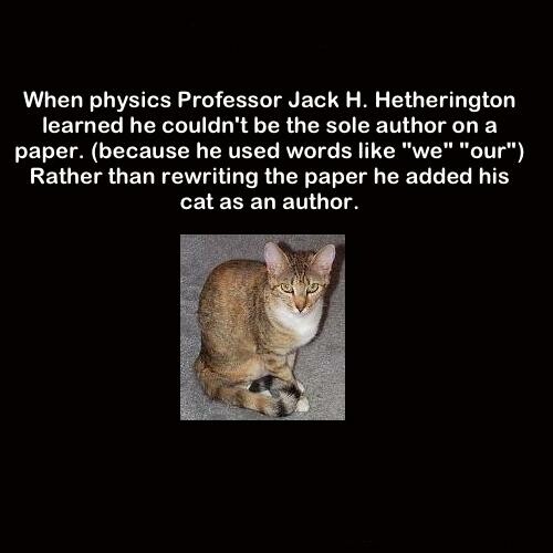 [ μτφ: Όταν ο καθηγητής φυσικής Jack H. Hetherington πληροφορήθηκε πως δεν μπορούσε να καταθέσει την επιστημονική του διατριβή υπό το όνομα του και μόνο -επειδή χρησιμοποιούσε συνεχώς πρώτο πληθυντικό στην σύνταξη του- , αντί να την ξαναγράψει διορθώνοντας τα 'εμείς' σε 'εγώ', πρόσθεσε την γάτα του(!) σαν συγγραφέα της εργασίας..]