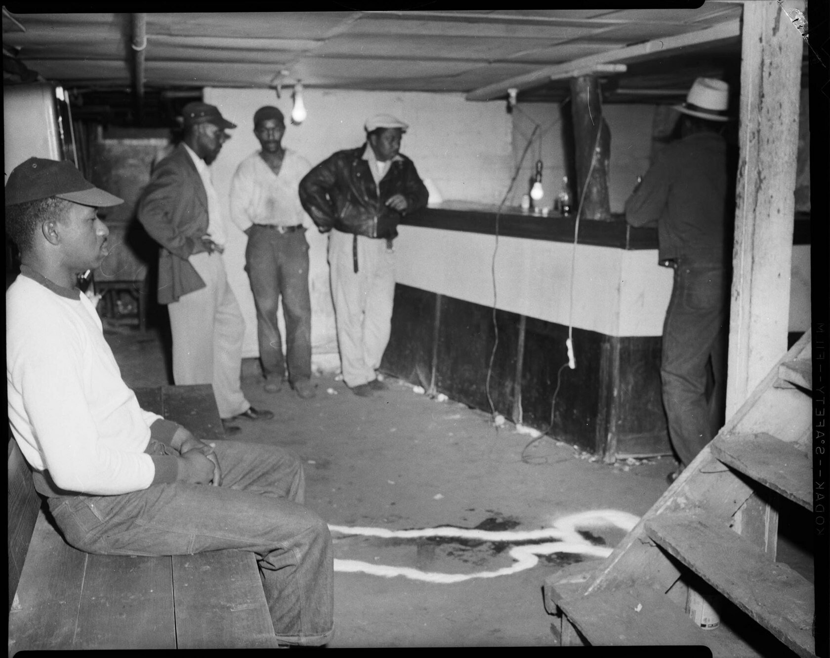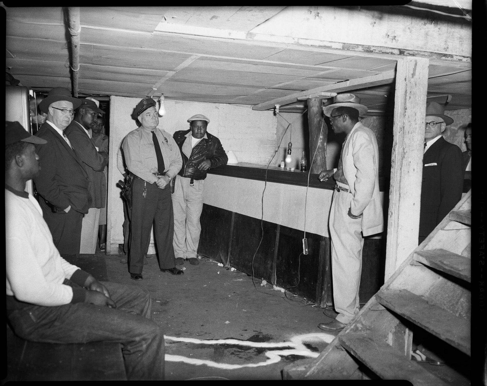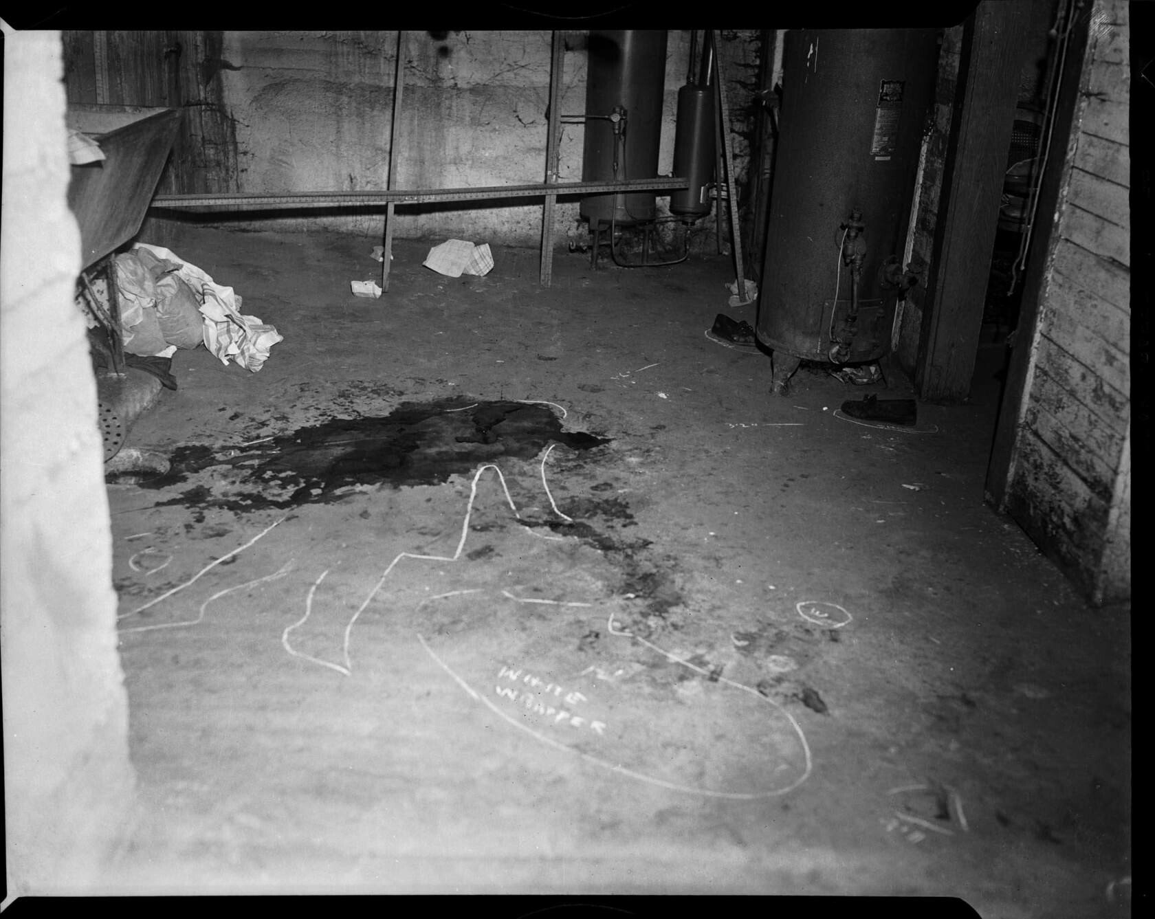 Άνδρες στέκονται γύρω από τη σκηνή του εγκλήματος με το περίγραμμα του πτώματος του William Lee Jr., στο υπόγειο μπαρ του σπιτιού Burkett home, 1127 Washington Avenue, Braddock - 27 Σεπτεμβρίου 1955.