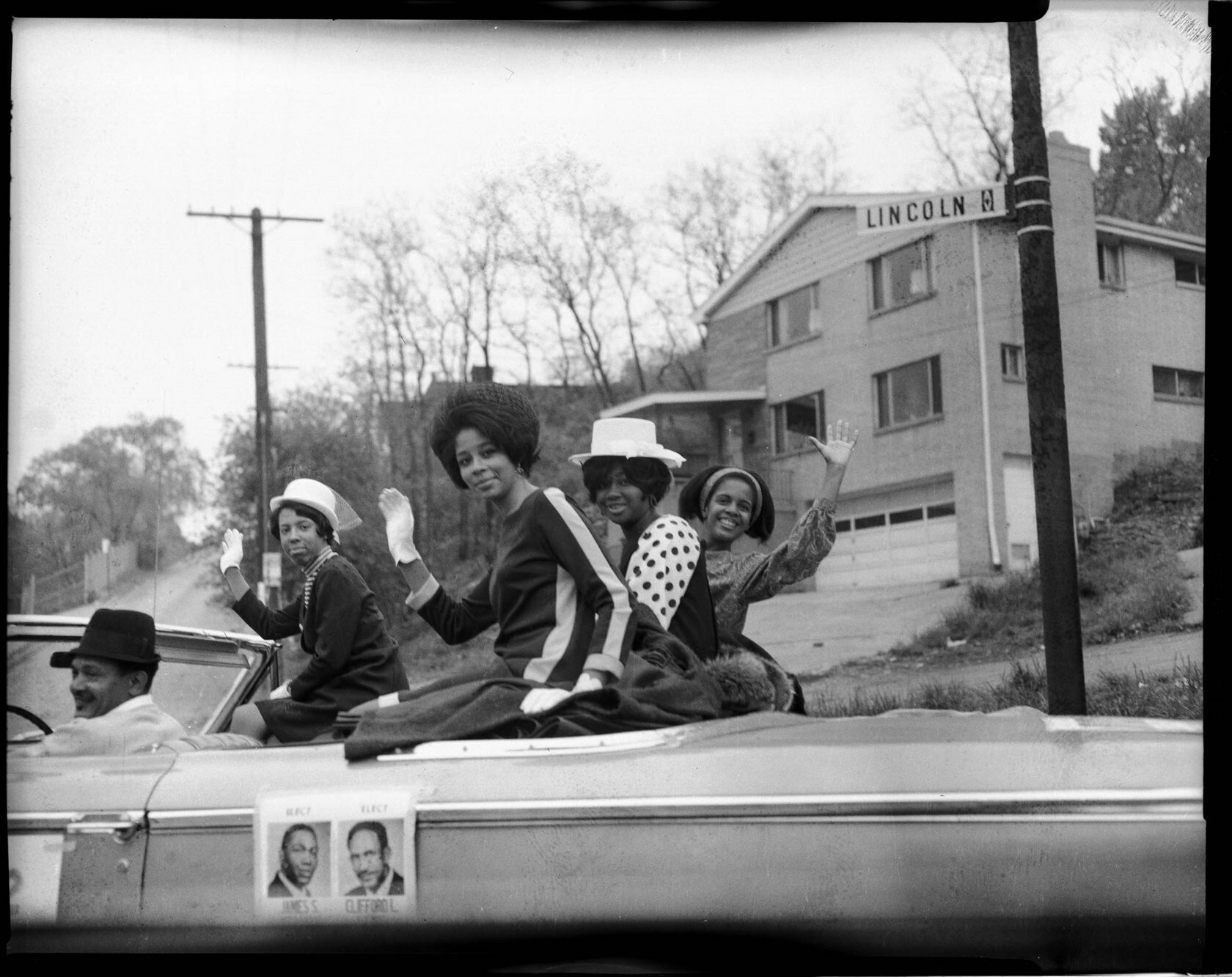 Τέσσερις γυναίκες κάθονται σε ένα καμπριολέ και χαιρετούν, με οδηγό έναν άνδρα στη λεωφόρο Λίνκολν. Υπάρχουν στο πλάι δύο προεκλογικές αφίσες των James S. και Clifford L.