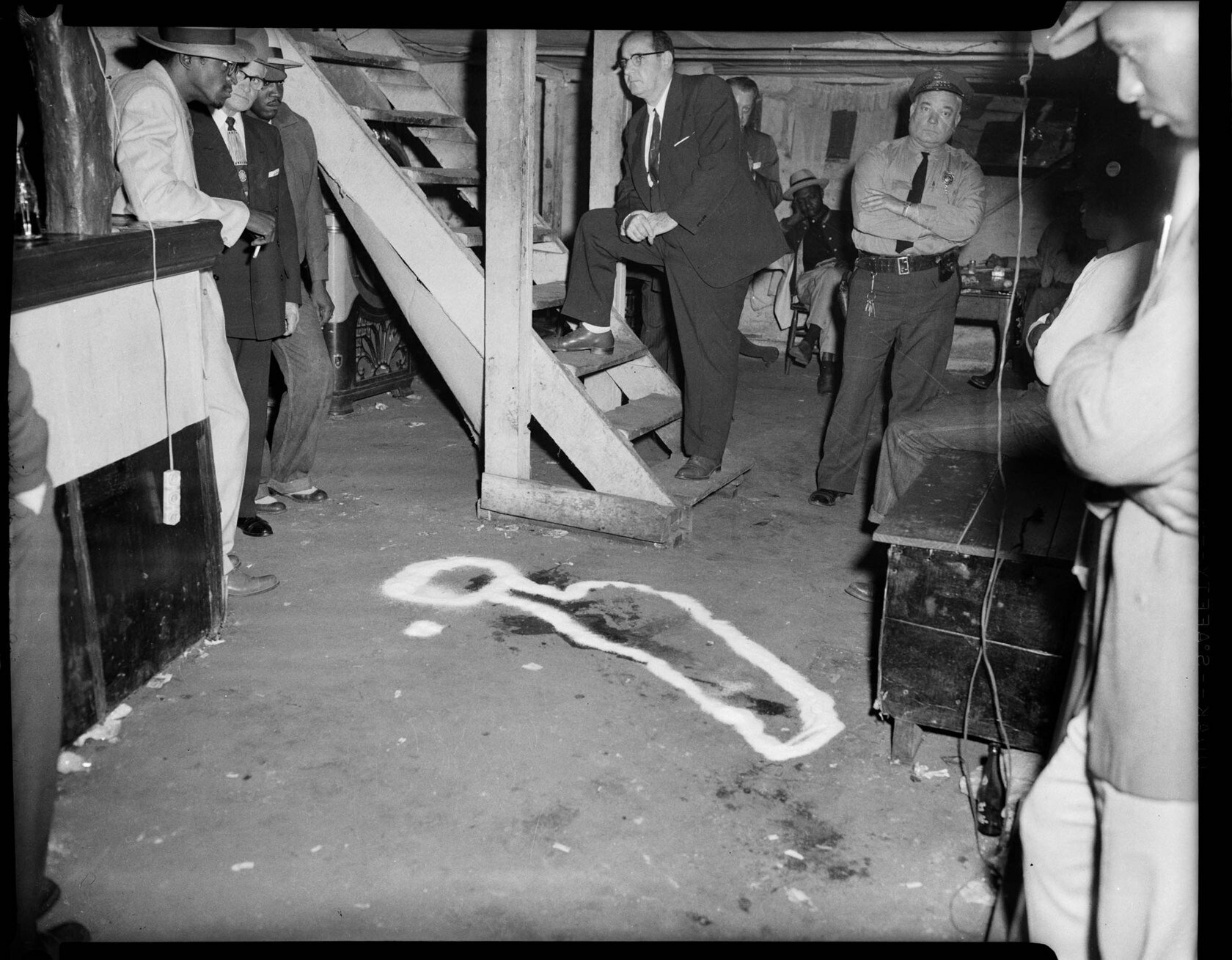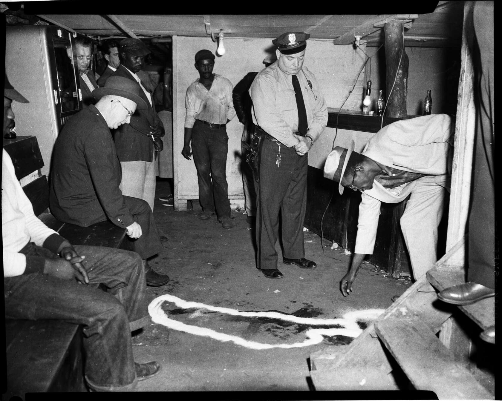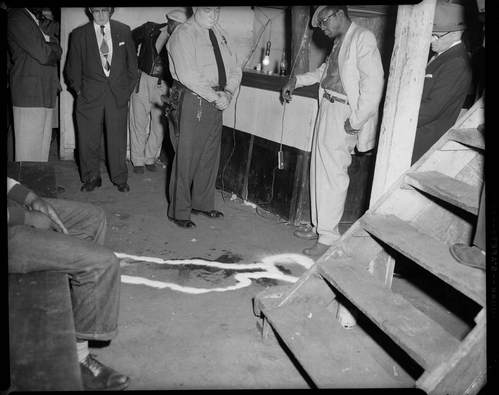 Ο ύποπτος για φόνο Theodore Penn στέκεται στα δεξιά του περιγράμματος από το σώμα του William Lee Jr., με τον βοηθό αρχηγό της αστυνομίας Joseph P. Devlin να στέκεται με τα χέρια στις τσέπες κοντά στο κέντρο, στο υπόγειο μπαρ του Burkett home, 1127 Washington Avenue, Braddock - 27 Σεπτεμβρίου 1955.