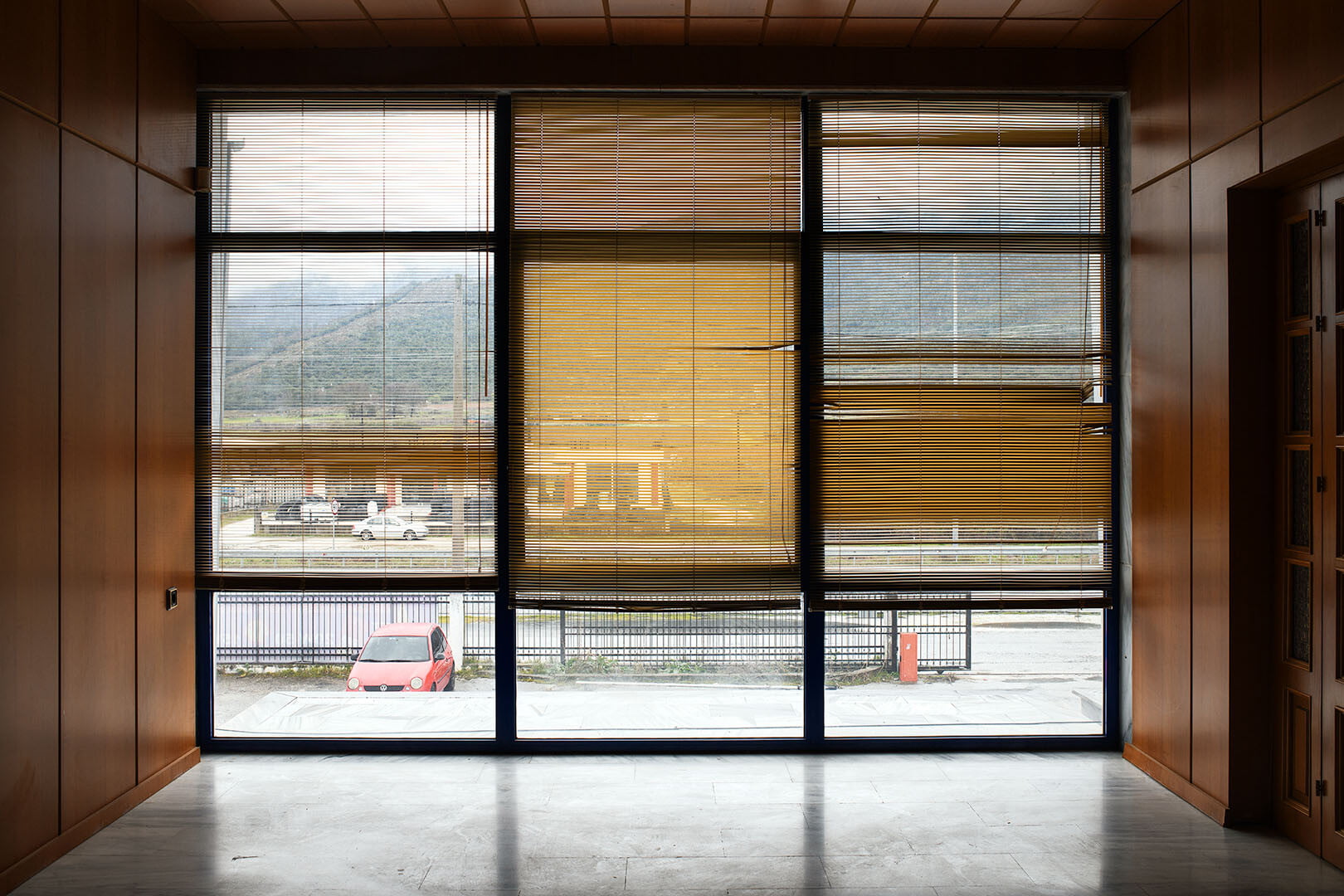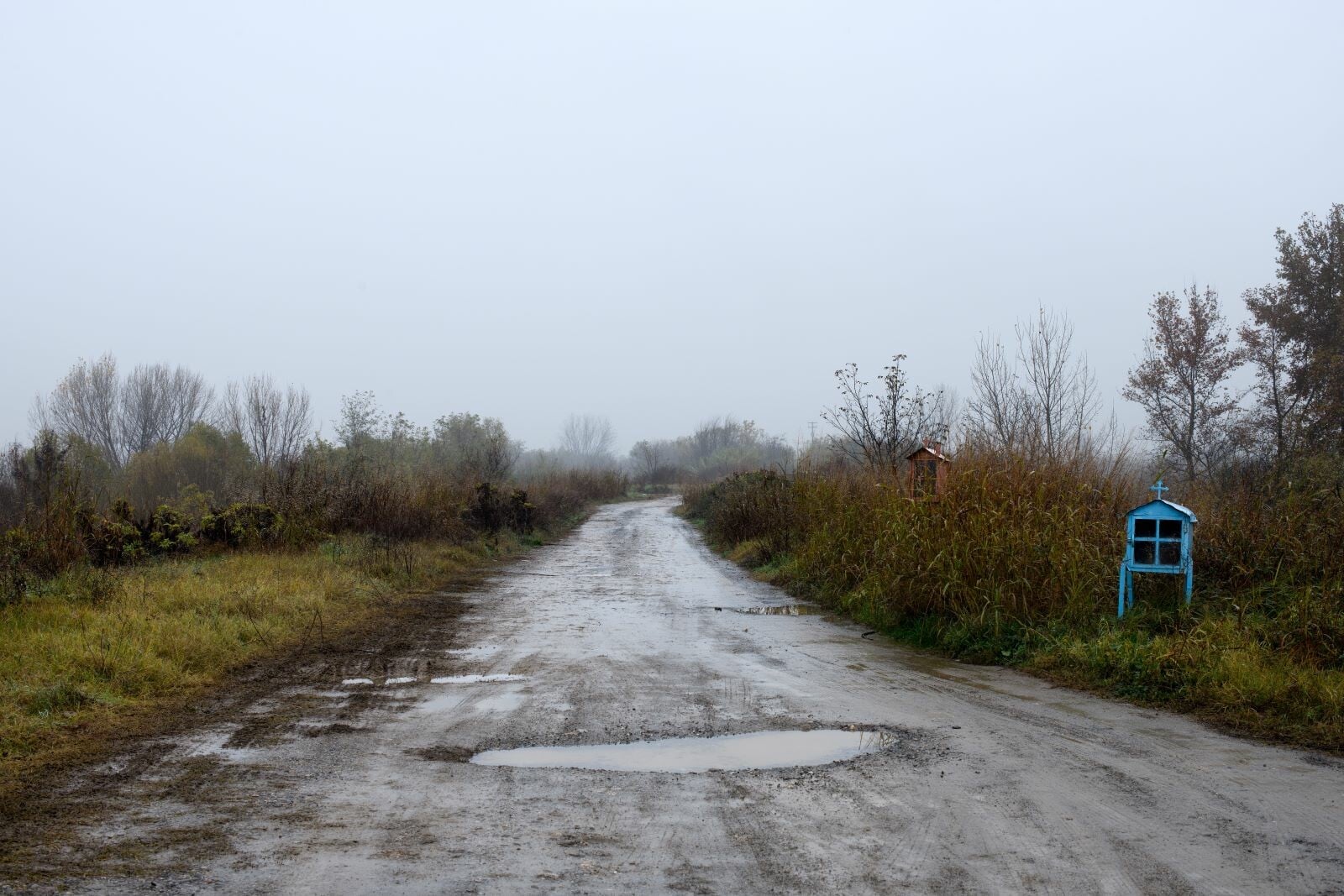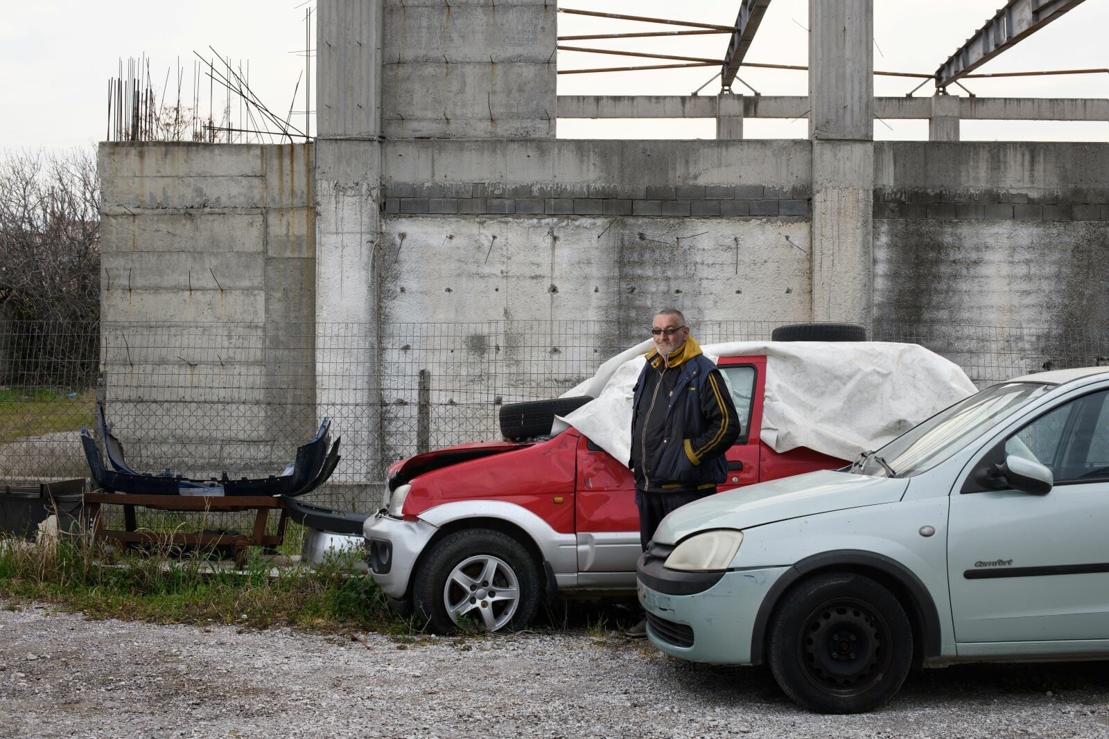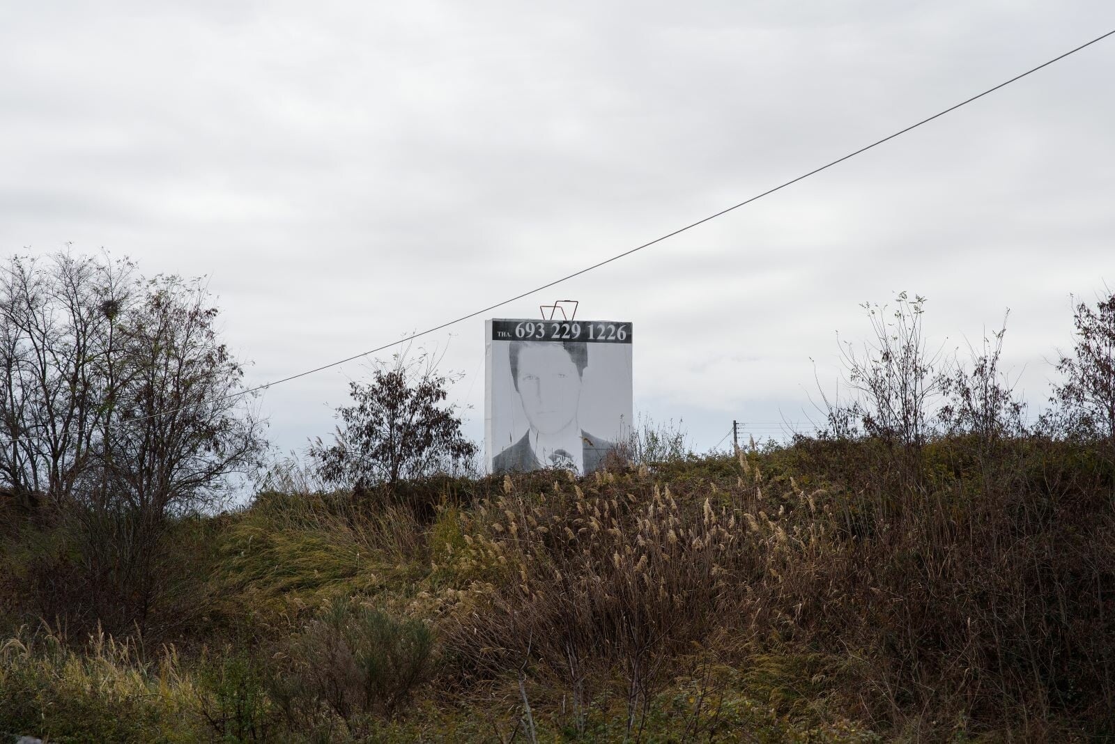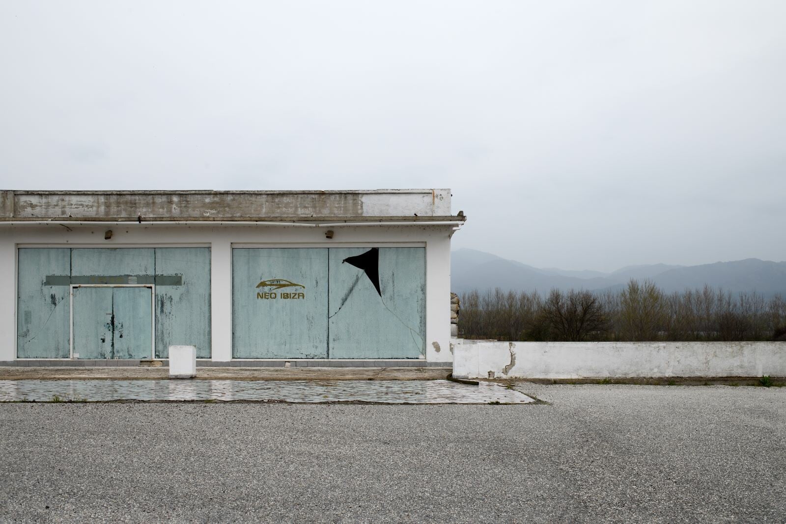 Πέρα, όμως, από τη συνεκτική αίσθηση που γεννούν κάποιες ενότητες, αρκετές μεμονωμένες φωτογραφίες φέρουν ειδικό βάρος. Σε μία από αυτές, έξω από την Κατερίνη, ένα ανδρικό μοντέλο ορθώνεται, επιβλητικά όσο και αυθαίρετα, μέσα από μια διαφήμιση μόδας πίσω από τα ξερόκλαδα, απευθύνοντας προς την εθνική οδό ένα απρόσκλητο σαγηνευτικό βλέμμα. Ο αριθμός κινητού τηλεφώνου που διακρίνεται ως προμετωπίδα, χωρίς άλλη πληροφορία, παραπέμπει σε γειτονική μονάδα ενδυμάτων καθιστώντας την εικόνα ένα σύγχρονο αρχέτυπο πώλησης. Αντίθετα, στη φωτογραφία της κλειστής αντιπροσωπείας αυτοκινήτων στην Κομοτηνή, οι γαλακτόχρωμες τζαμαρίες αποκλείουν το βλέμμα εντός, καθώς η ήπια λοφοσειρά στο βάθος σμίγει χαμηλόφωνα με το άκαμπτο σχήμα του κτηρίου. Το μικρό σπάσιμο της τζαμαρίας διαγράφει ένα βίαια αιχμηρό, αφαιρετικού σχήματος, άνοιγμα πίσω από το οποίο ελλοχεύει δυσοίωνα το σκοτάδι.