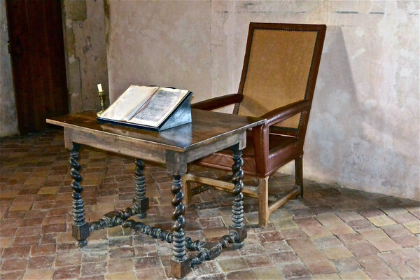"Εδώ που μένω, πιο συχνά με βρίσκει κανείς στη βιβλιοθήκη μου, όπου μου είναι πολύ εύκολο να διευθύνω το σπιτικό μου : είμαι πάνω από την είσοδο, και βλέπω από κάτω τον κήπο μου, το κοτέτσι μου, την αυλή μου, και τους περισσότερους από τους ανθρώπους του σπιτικού μου που περιφέρονται εκεί. Εδώ, τη μια ώρα ξεφυλλίζω ένα βιβλίο, την άλλη ώρα ένα άλλο, χωρίς σειρά και χωρίς σκοπό, αποσπασματικά. Πότε ρεμβάζω, πότε συλλαμβάνω και υπαγορεύω, βηματίζοντας, τους οραματισμούς που μοιράζομαι μαζί σας. Η βιβλιοθήκη βρίσκεται στον τρίτο όροφο ενός πύργου. Στον πρώτο, είναι το παρεκκλήσι μου, στο δεύτερο ένα δωμάτιο με τους βοηθητικούς του χώρους, όπου κοιμάμαι συχνά για να είμαι μόνος. Από πάνω υπήρχε ένα μεγάλο βεστιάριο. 'Ηταν την παλιά εποχή το πιο άχρηστο μέρος του σπιτιού μου. Εδώ περνάω τις περισσότερες μέρες της ζωής μου και τις περισσότερες ώρες της ημέρας. Τη νύχτα δεν είμαι ποτέ εκεί. Στην προέκταση του δωματίου αυτού υπάρχει ένα πολύ ευχάριστο και καλά διαμορφωμένο cabinet το οποίο μπορεί να θερμαίνεται το χειμώνα. Κι αν δεν υπολόγιζα τον κόπο και τα έξοδα, τον κόπο που με απομακρύνει από κάθε εργασία, θα μπορούσα κάλλιστα να προσθέσω σε καθε πλευρά μια στοά μήκους εκατό βημάτων και πλάτους δώδεκα, έχοντας βρει τους τοίχους στο ύψος που μου χρειάζονται. Κάθε απομονωμένος χώρος έχει ανάγκη από ένα μέρος που να προσφέρεται στο περπάτημα. Οι σκέψεις μου κοιμούναι αν τις βάζω να κάθονται και το πνεύμα μου λειτουργεί αλλιώς όταν κινούνται και τα πόδια.