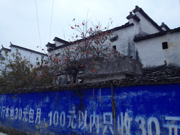 Bishan. 'Ενα παλιό κι ένα πιο σύγχρονο σπίτι με το χαρακτηριστικό αρχιτεκτονικό ύφος Hui. Το μπλε της μάντρας οφείλεται σε διαφήμιση εταιρείας τηλεπικοινωνιών. Φωτ. Asia Portal.