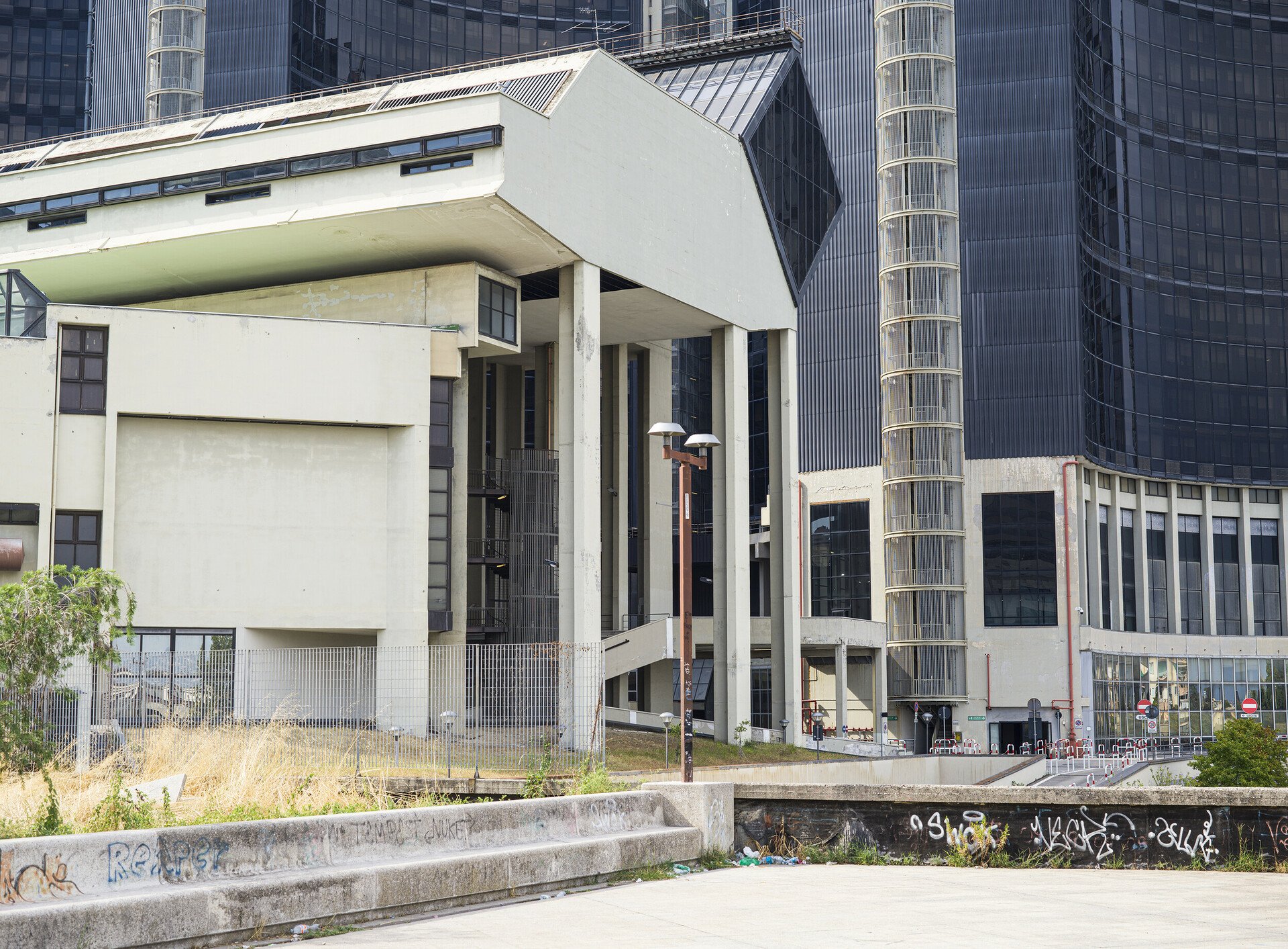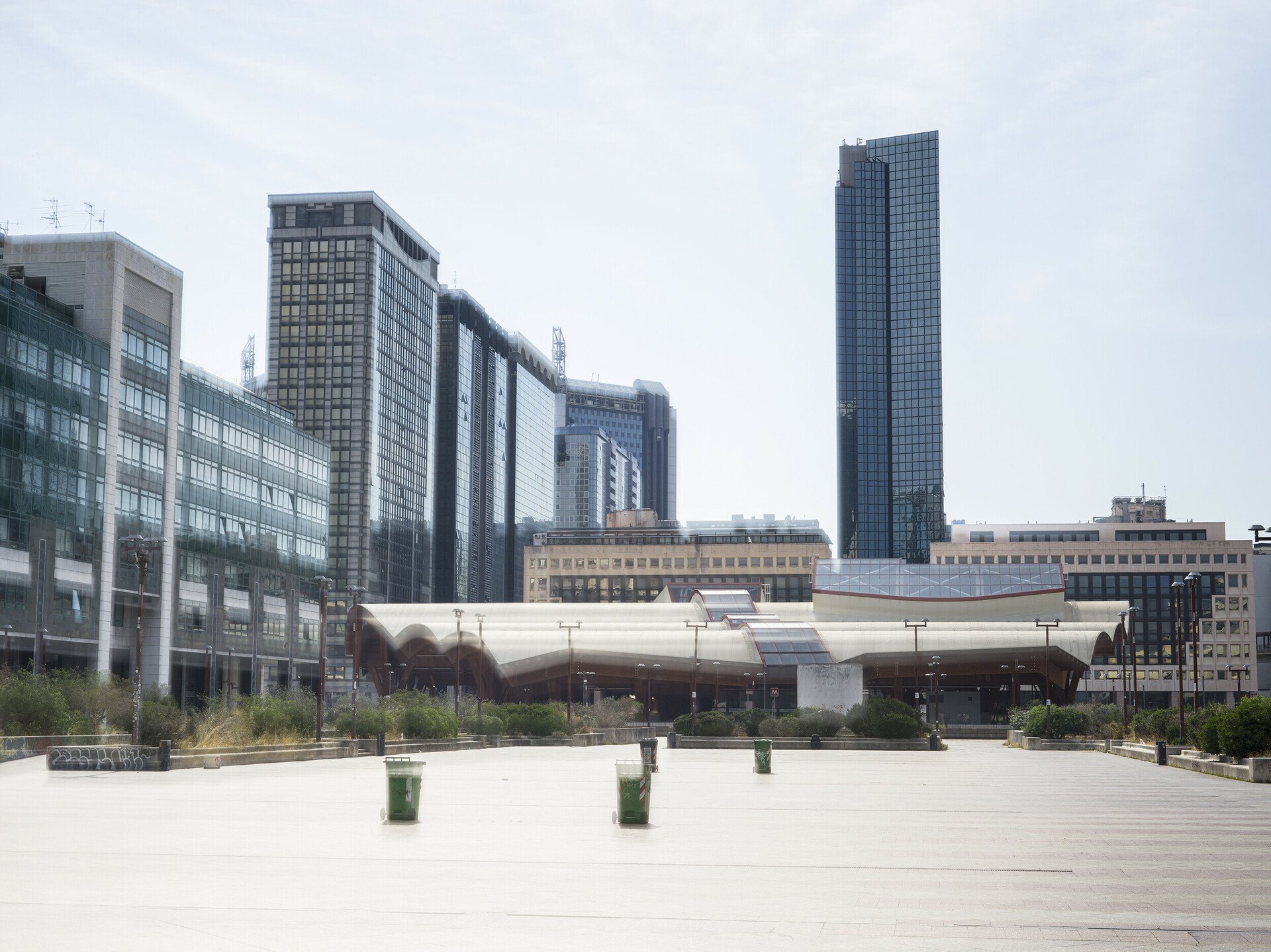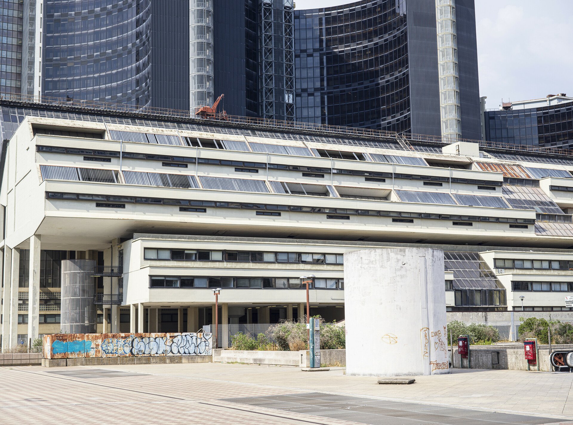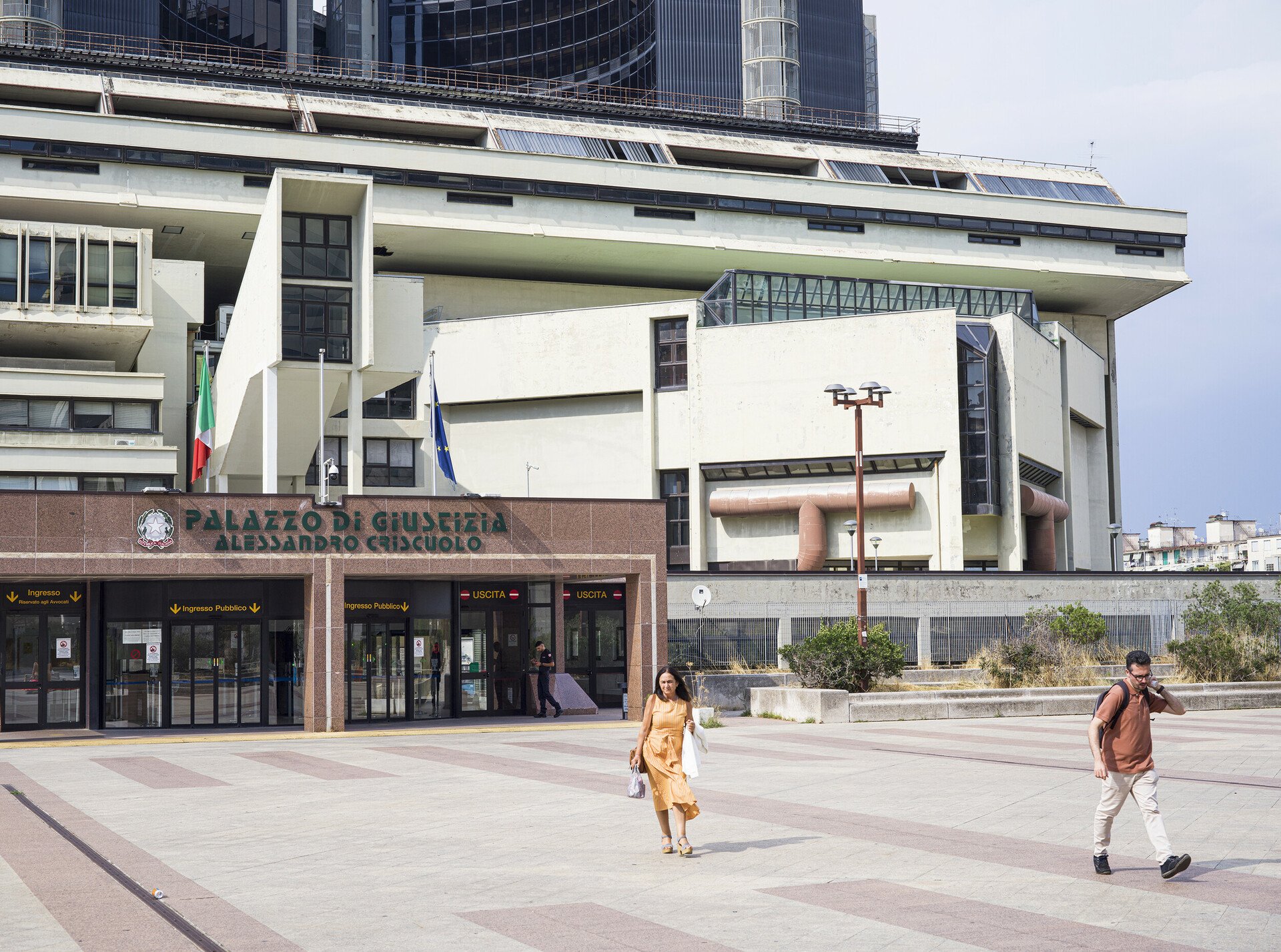 Η έξοδος του μετρό προς τα δικαστήρια και το αστικό συγκρότημα Centro Direzionale Napoli που σχεδίασε κυρίως ο Kenzo Tange, και στο οποίο συνέβαλαν με ουρανοξύστες και άλλοι αρχιτέκτονες, όπως ο Renzo Piano (το κτίριο της Olivetti).