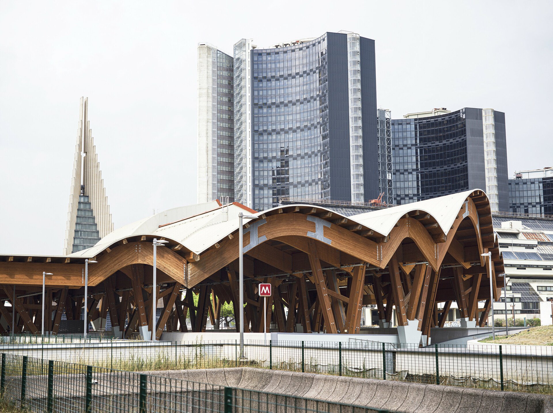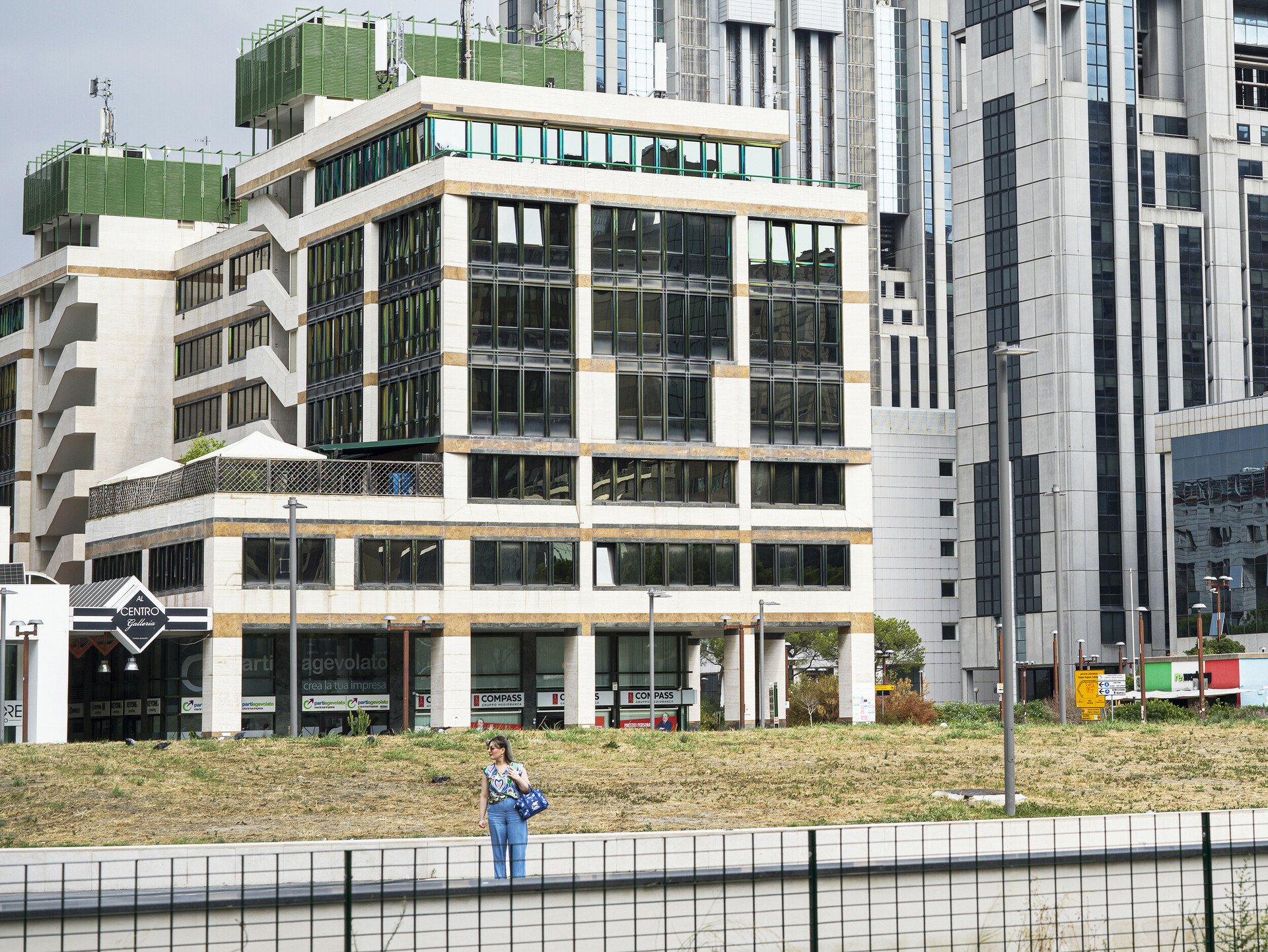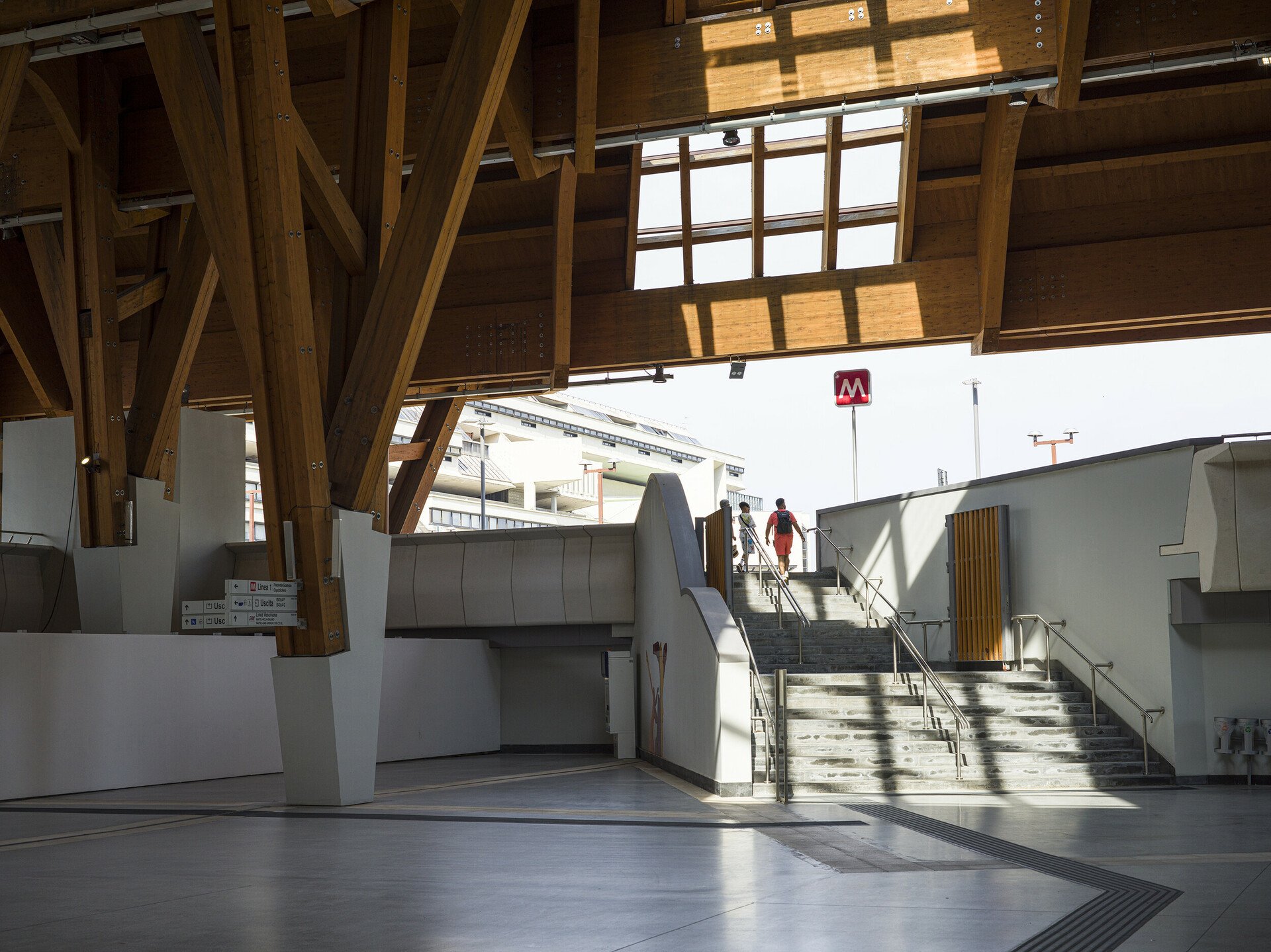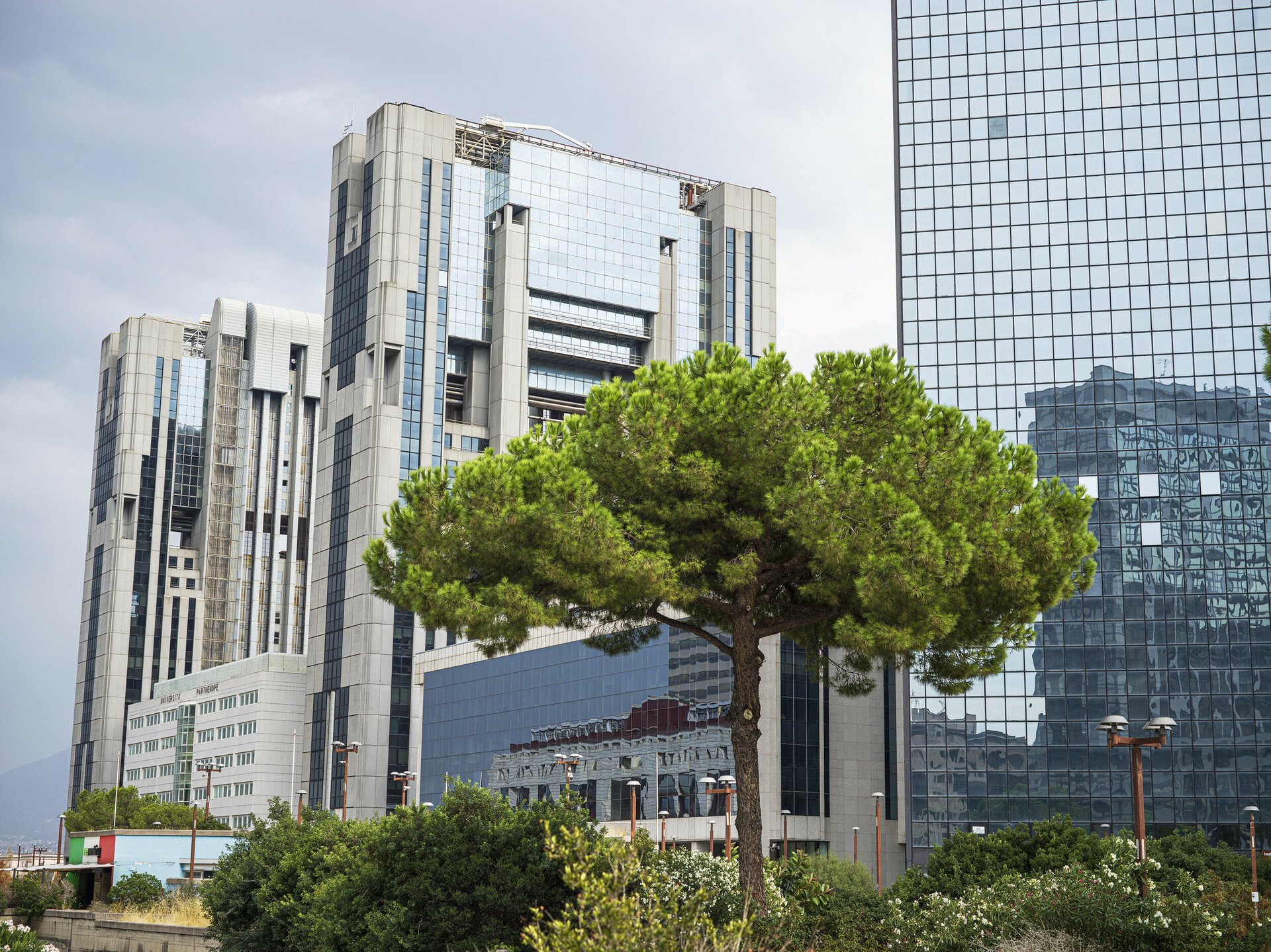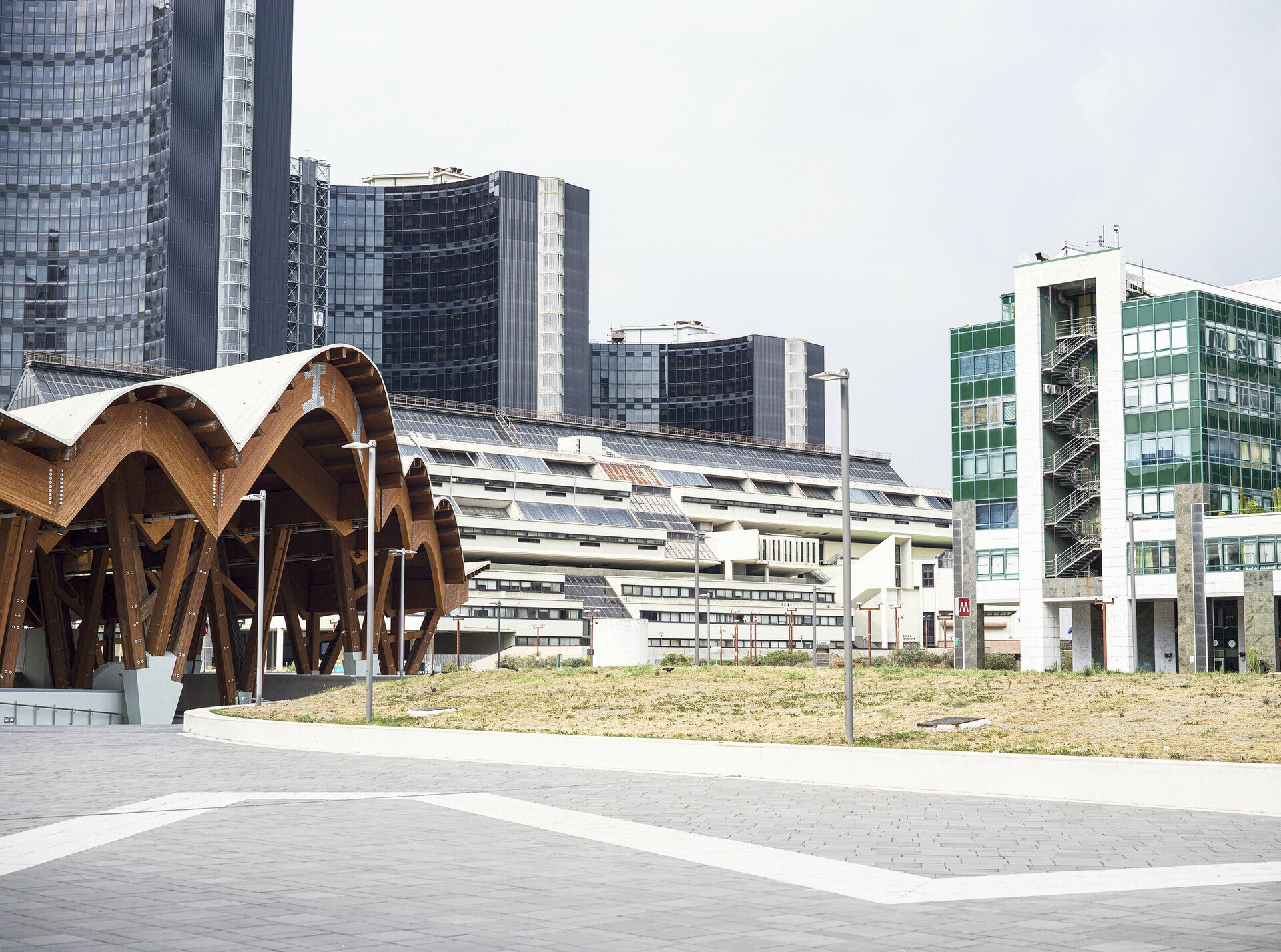 Η έξοδος του μετρό προς τα δικαστήρια και το αστικό συγκρότημα Centro Direzionale Napoli που σχεδίασε κυρίως ο Kenzo Tange, και στο οποίο συνέβαλαν με ουρανοξύστες και άλλοι αρχιτέκτονες, όπως ο Renzo Piano (το κτίριο της Olivetti).