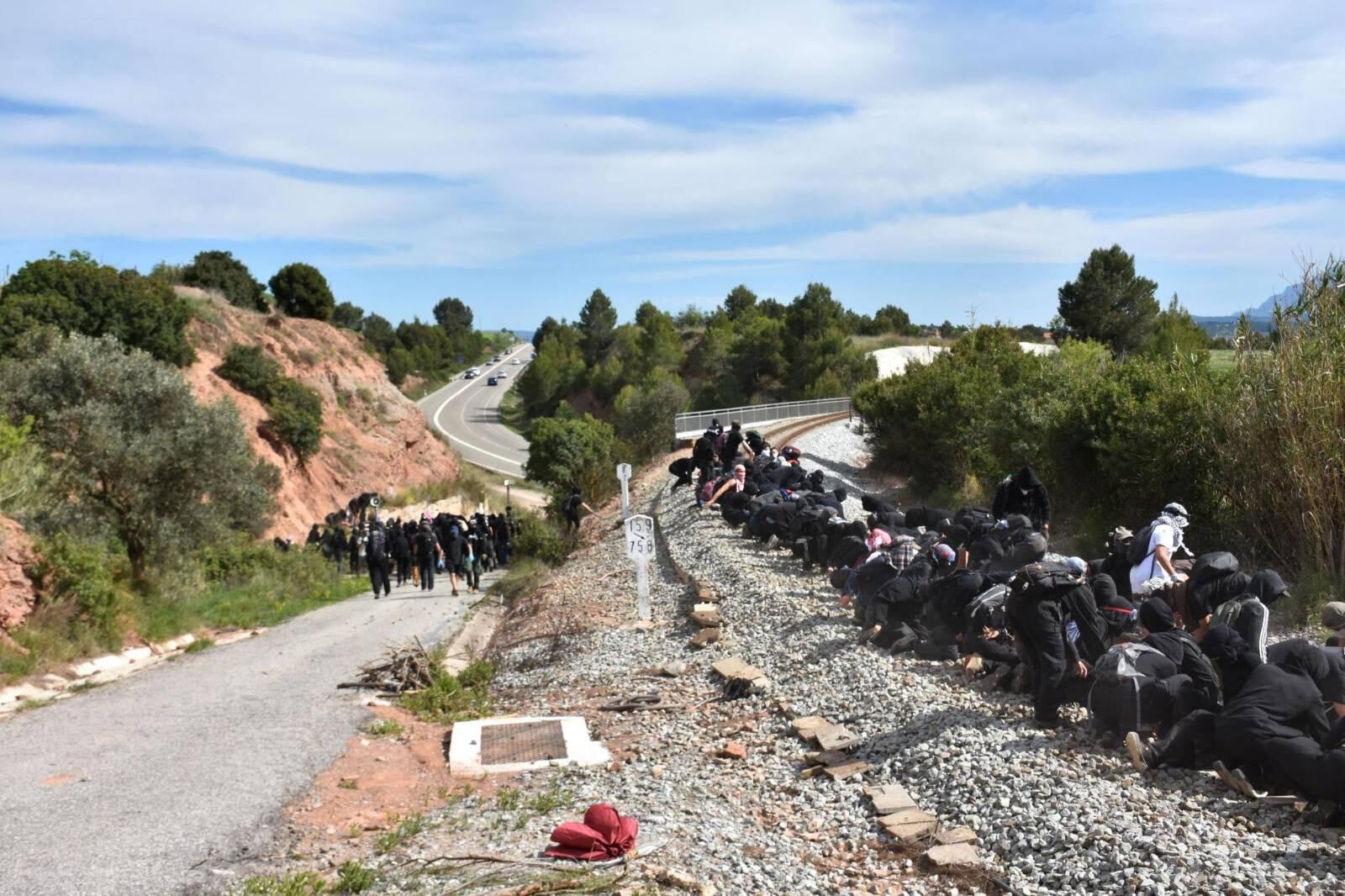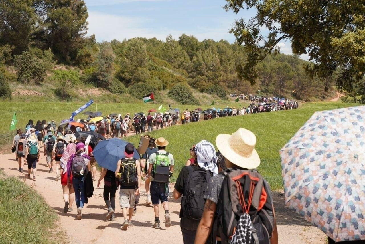 Μια "κρυφή" πορεία ξεκινά με μια απότομη ανηφόρα μέσα στις φυλλωσιές, με τη Manresa στην κοιλάδα και το Montserrat στο βάθος. Μισή ώρα αργότερα, εμφανίζεται μια σιδηροδρομική γραμμή. Είναι αυτή που επιτρέπει στην Israel Chemicals να μεταφέρει καθημερινά αρκετά τρένα γεμάτα ποτάσα, η οποία προορίζεται για λιπάσματα που χρησιμοποιούνται από την αγροτοβιομηχανία. Κατεβαίνουν τότε όλοι γρήγορα την πλαγιά, μαζεύοντας κλαδιά στο πέρασμά τους. Οδοφράγματα στήνονται στον δρόμο που οδηγεί στις ράγες και ένα μεγάλο μέρος από τα 600 άτομα καταλαμβάνει τις γραμμές. Σε μια εκκλησία πουστέκεται από πάνω μας, τα γυρίσματα μιας ταινίας εποχής διακόπτονται από μια σκηνή σαφώς πιο "πικάντικη". Τέσσερις κλούβες της αστυνομίας φτάνουν λίγα λεπτά αργότερα από την κοντινή οδό ταχείας κυκλοφορίας, αλλά είναι αργά: ο χώρος έχει ήδη καταληφθεί. Εγκαθίστανται λίγο πιο κάτω. Σε δυσμενή θέση και λιγότεροι αριθμητικά, αναγκάζονται να μην παρέμβουν μπροστά στο πλήθος που είναι αποφασισμένο να σταματήσει για λίγο τον εξορυκτισμό προς όφελος μιας ισραηλινής εταιρείας που στηρίζει ενεργά τον γενοκτονικό στρατό. Ένα πανό που ξεδιπλώνεται με το σύνθημα Del Llobregat al Jorda, ni genocidi ni ecocidi (Από τον Λιοβρεγάτ στον Ιορδάνη, ούτε γενοκτονία ούτε οικοκτονία) συνδέει το τοπικό ποτάμι που πλήττεται από το ορυχείο με το εμβληματικό ποτάμι της Παλαιστίνης.