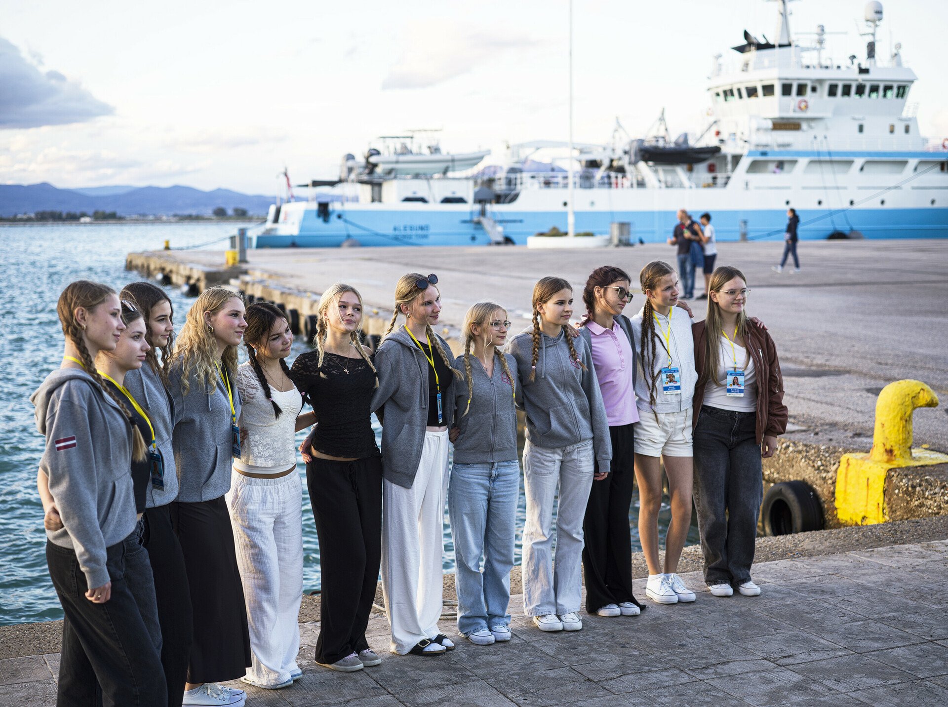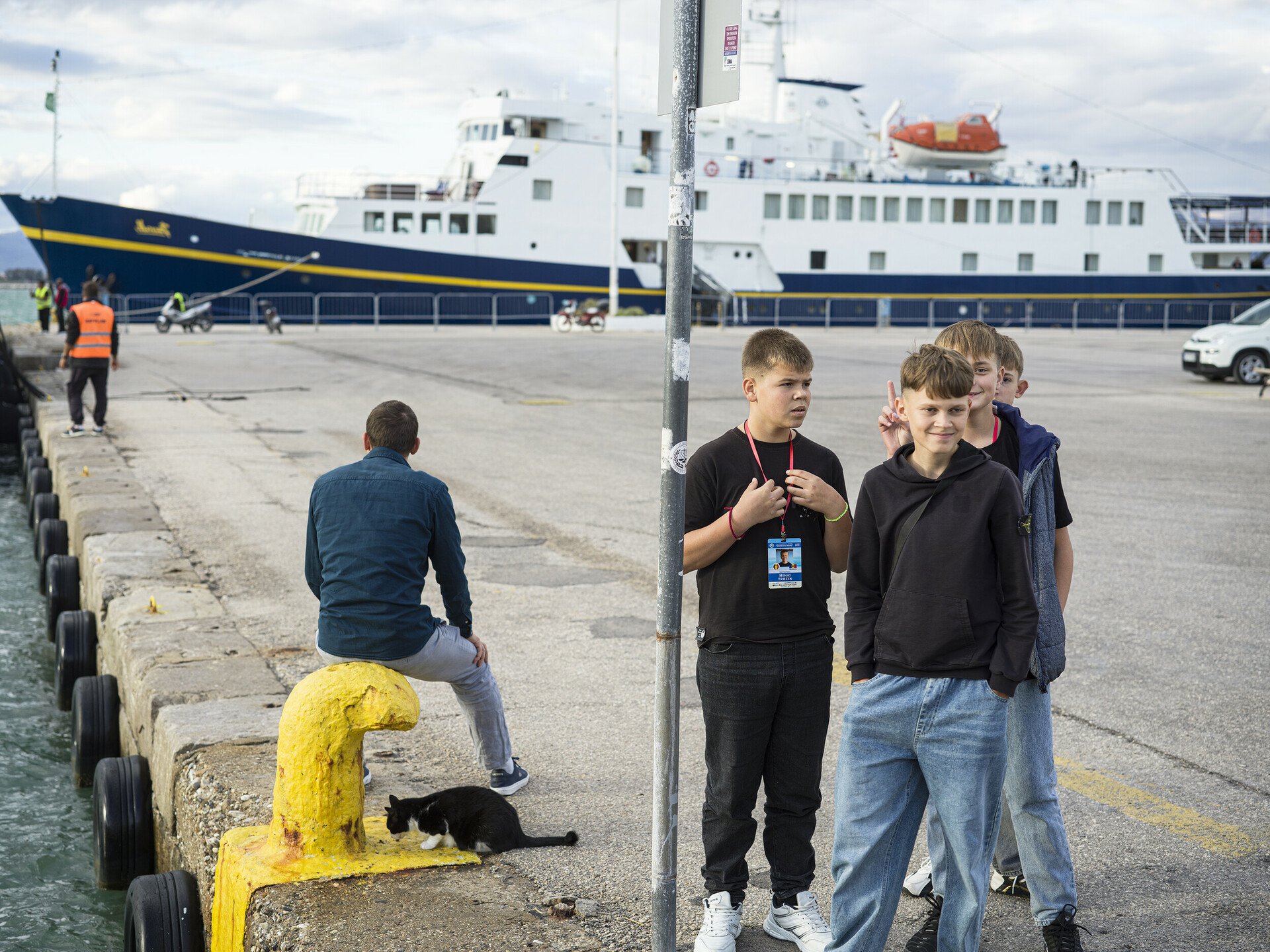 Διαγωνιζόμενα αγόρια με φόντο το MS Monet