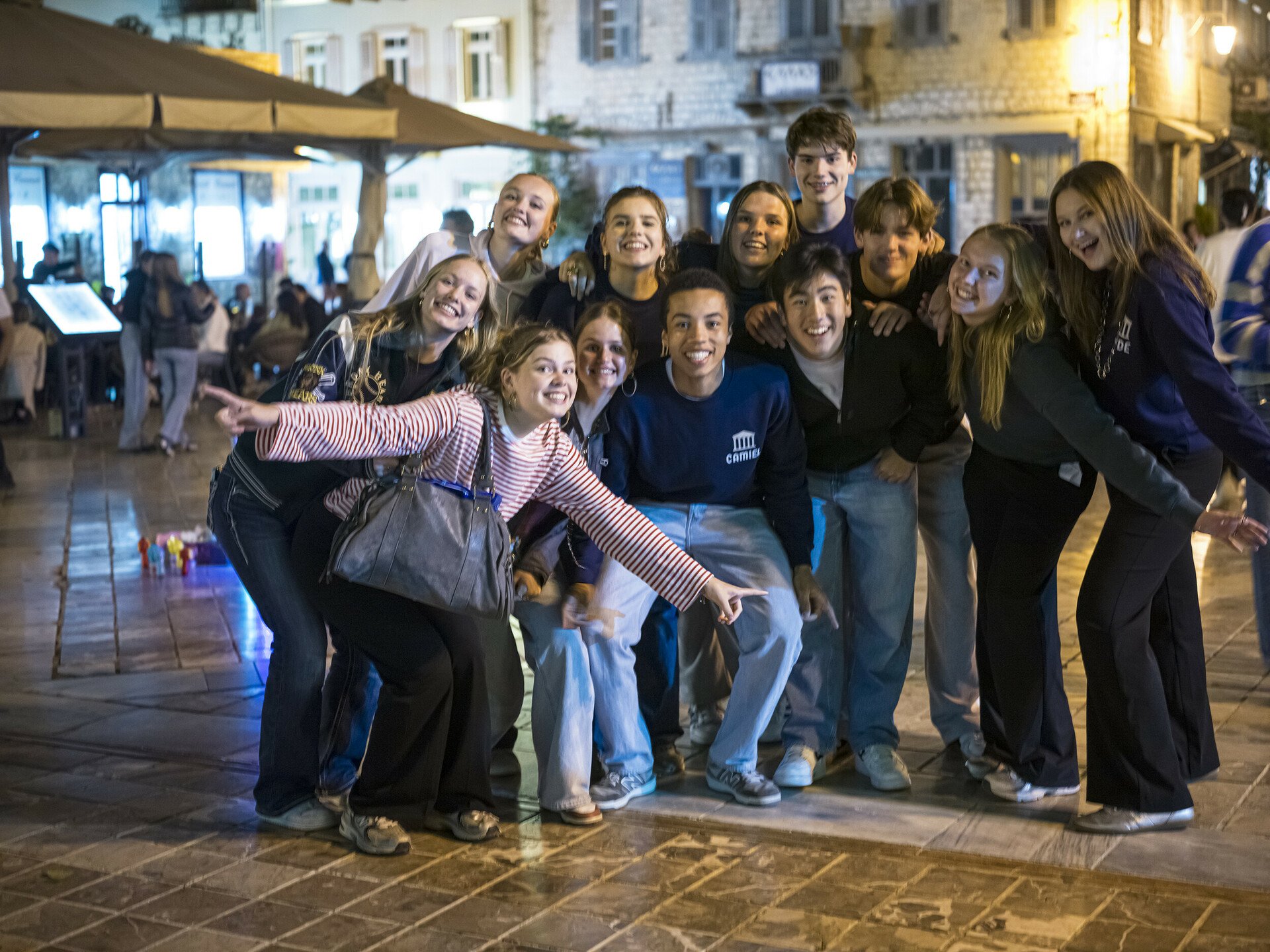 Ομάδα ξένων σπουδαστών ("Hellas '25") μπροστά στο κλειστό πλέον ιστορικό εστιατόριο ΕΛΛΑΣ
