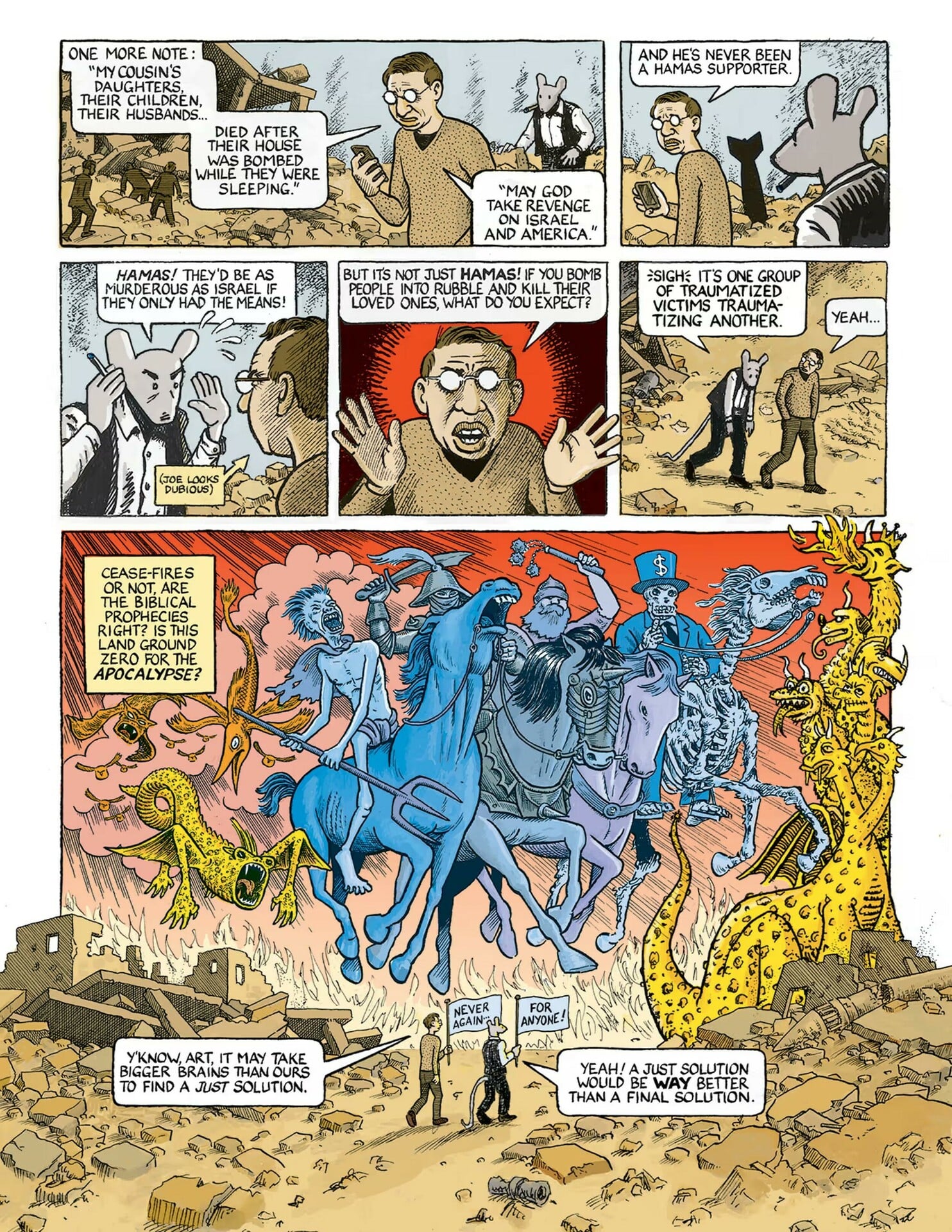 Η παρουσίαση των σελίδων τους, αλλά και των υπέροχων προσχεδίων τους, δίνει μια εικόνα της συλλογικής εργασίας αυτών των δύο μαιτρ του documentary comic, της μηχανικής της εικονογραφικής τους συνεργασίας, καθώς και των ερωτημάτων τους καθ' όλη τη διάρκεια αυτής της διαδικασίας: μέχρι ποιο σημείο απεικονίζεται η φρίκη; Πώς να διατηρηθεί η σωστή απόσταση; Πώς να βρεθούν οι σωστές λέξεις, σε αυτήν την σύγκρουση που είναι και σύγκρουση φαντασιακών και σημασιολογίας; Το αποτέλεσμα είναι μια σειρά από τρία strips που καταφέρνουν, σε λίγα μόνο τετραγωνάκια, να αποτυπώσουν καλύτερα από μακροσκελή κείμενα τη φρίκη που εκτυλίχθηκε από τις 7 Οκτωβρίου 2023, από την αιματηρή επίθεση των κομάντος της Χάμας μέχρι την τυφλή καταστολή των ισραηλινών βομβών. Με αυτή τη θλιβερή διαπίστωση, που ισχύει εκεί όπως και αλλού: η Εκδίκηση είναι μια διαβολική μηχανή που διψάει πάντα για αίμα. Και η ιστορία των επόμενων πολέμων γράφεται ήδη, με το μαύρο μελάνι του μίσους.
