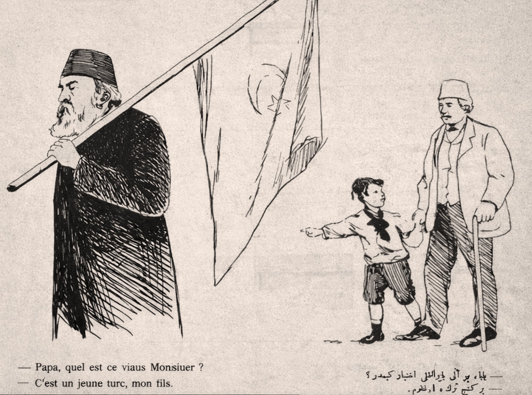 Ο σατιρικός τύπος γνώρισε επίσης μια εντυπωσιακή άνθηση, με χιουμορίστες και γελοιογράφους να δίνουν τον καλύτερο εαυτό τους στις στήλες των νέων εφημερίδων: ο Karagöz (ο Μαυρομάτης, το περίφημο θέατρο σκιών), ο Davul (Το Τύμπανο), η Kalem (Η Πένα), όπως εδώ με αυτό το σχέδιο ενός γέρου "Νεότουρκου" (18 Σεπτεμβρίου 1908). Στην Τουρκία του Ερντογάν, αντίθετα, οι γελοιογράφοι καλό είναι να το σκέφτονται δύο φορές. Το τελευταίο περιστατικό, το καλοκαίρι του 2025, αφορούσε το περιοδικό Leman, του οποίου τέσσερις συνεργάτες συνελήφθησαν βίαια. Οι εγκαταστάσεις δέχθηκαν επίθεση από εθνικιστές και ισλαμιστές που κραύγαζαν περί "βλασφημίας" και ζητούσαν "εκδίκηση" για μια υποτιθέμενη απεικόνιση του Προφήτη.