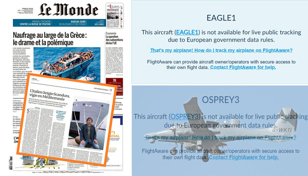 Το βράδυ της Τετάρτης 15 Απριλίου, στην οθόνη της πλατφόρμας FlightAware εμφανίστηκε ένα κυβερνητικό μήνυμα που επέβαλε μπλακάουτ για δύο αεροσκάφη: το Eagle1 και το Osprey3. Ονόματα που, όπως έγραψε χθες ο Vittorio Alessandro στο βιβλίο του PuntoNave, "δεν λένε τίποτα σε κανέναν, εκτός από τους λίγους γνώστες: είναι τα αεροσκάφη της Frontex που περιπολούν στα Στενά της Σικελίας για την αναζήτηση ανθρώπων στη θάλασσα, των οποίων τα ίχνη, από χθες το βράδυ, με εντολή της "ευρωπαϊκής κυβέρνησης" έχουν εξαφανιστεί από την πλατφόρμα FlightAware". Πράγματι, στην εν λόγω πλατφόρμα εμφανίστηκε το μήνυμα "Αυτό το αεροσκάφος δεν είναι διαθέσιμο για δημόσιο εντοπισμό σε πραγματικό χρόνο λόγω των κανόνων της ευρωπαϊκής ένωσης για τα δεδομένα".