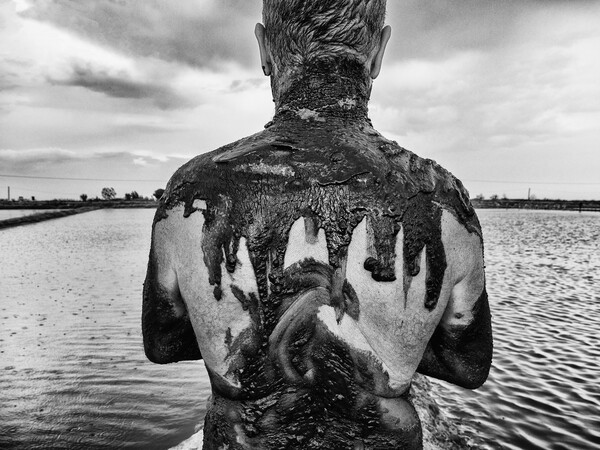 Το μινιμαλιστικό τοπίο της περιοχής, με τους έντονους γεωμετρικούς διαχωρισμούς του χώρου και τα παράξενα όντα του να περιφέρονται σιωπηλά ανάμεσα στην γη, το νερό και τον ήλιο δημιουργούν στον επισκέπτη την αίσθηση ενός άλλου πλανήτη. Το άπλωμα της μαύρης λάσπης πάνω στο ανθρώπινο κορμί οδηγεί στη απόλυτη μεταμόρφωση του, απελευθερώνοντάς το από την ομορφιά ή την ασχήμια του, τονίζοντας μόνο την οντότητα χωρίς ταυτότητα. Η αναμονή του στεγνώματος και το άπλετο εκτυφλωτικό ηλιακό κάθετο φως επιβάλουν μια αλλοίωση της αίσθησης του χώρου και του χρόνου οδηγώντας τους λουόμενους σε μια εξωκοσμική σιωπή. Ένας τόπος απόλυτα διεγερτικός για το φωτογραφικό μάτι, που, όσο και να προσπαθήσει κανείς να αποφύγει την φορμαλιστική αντιμετώπιση του θέματος, αυτή σου επιβάλλεται με ένα φυσικό και αβίαστο τρόπο σαν τη μοναδική πρόταση προσέγγισής του.