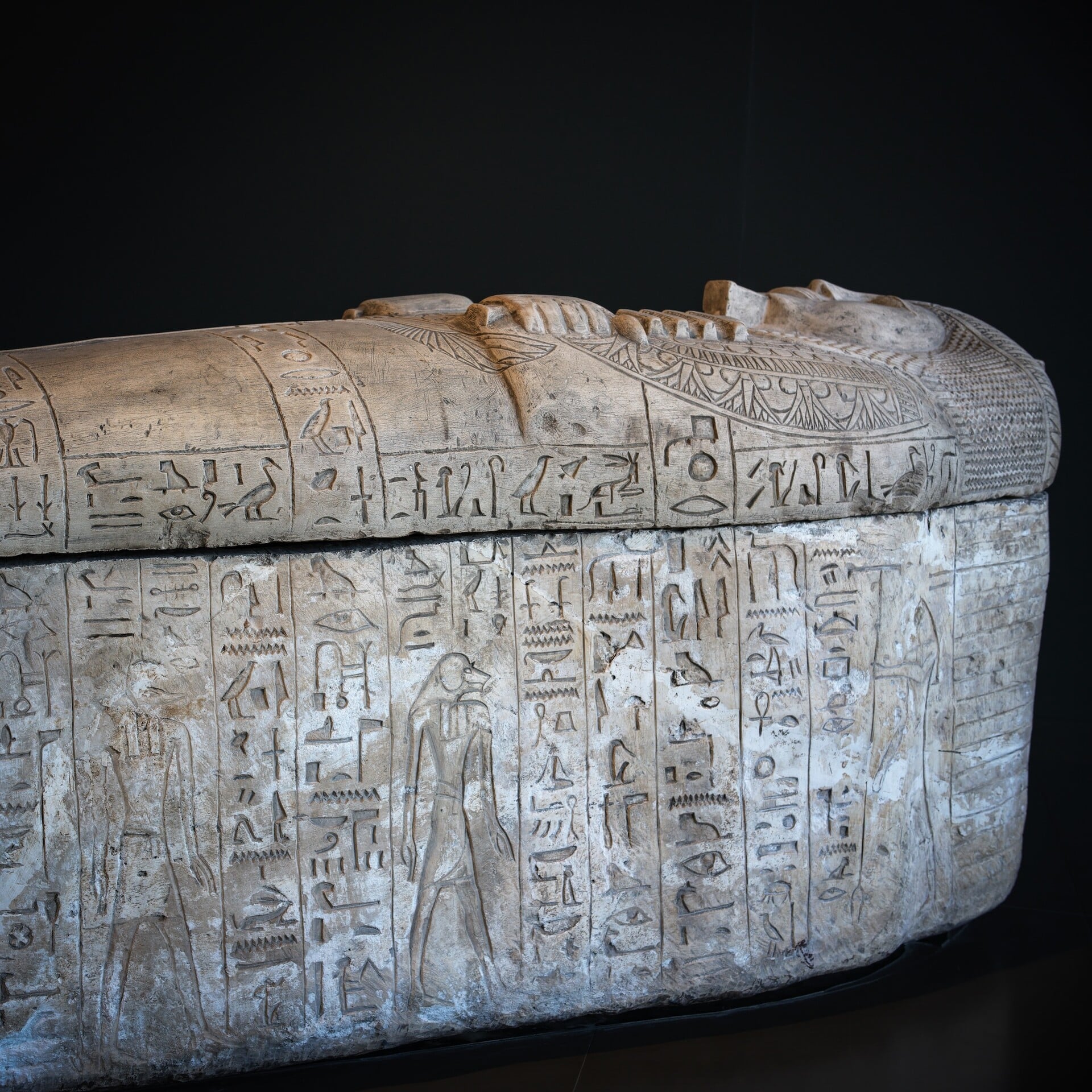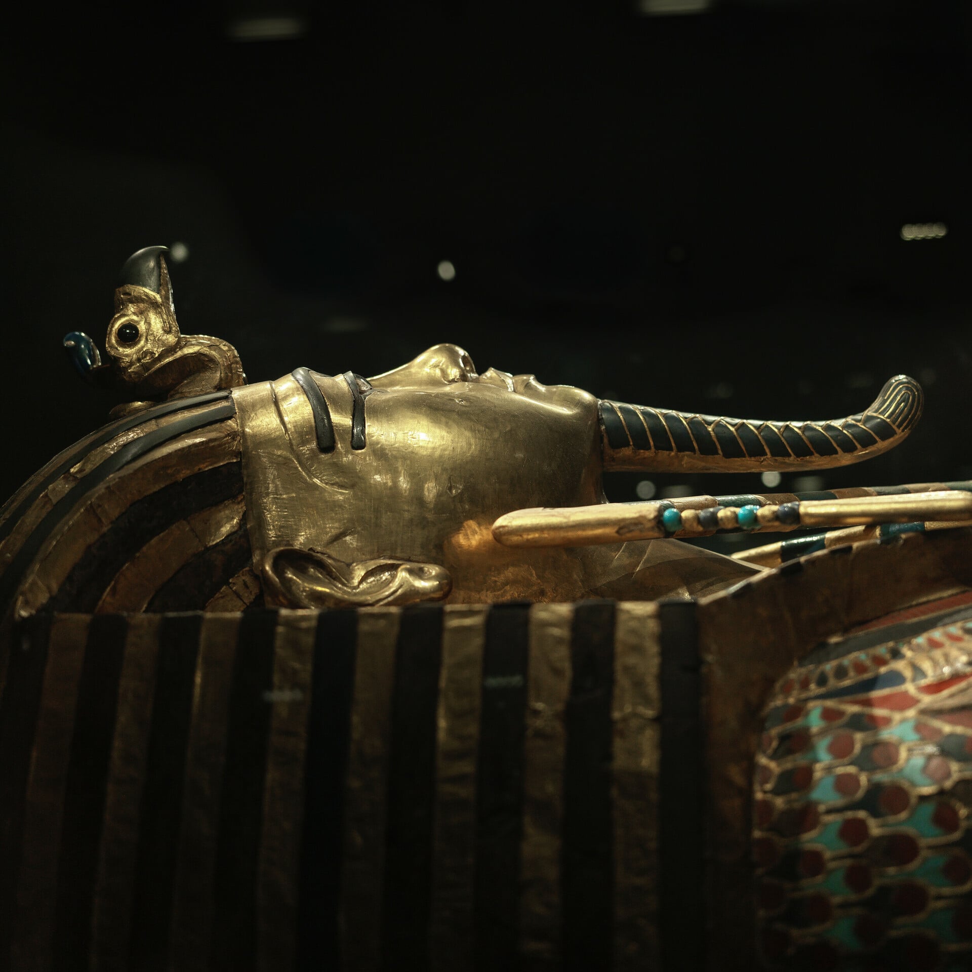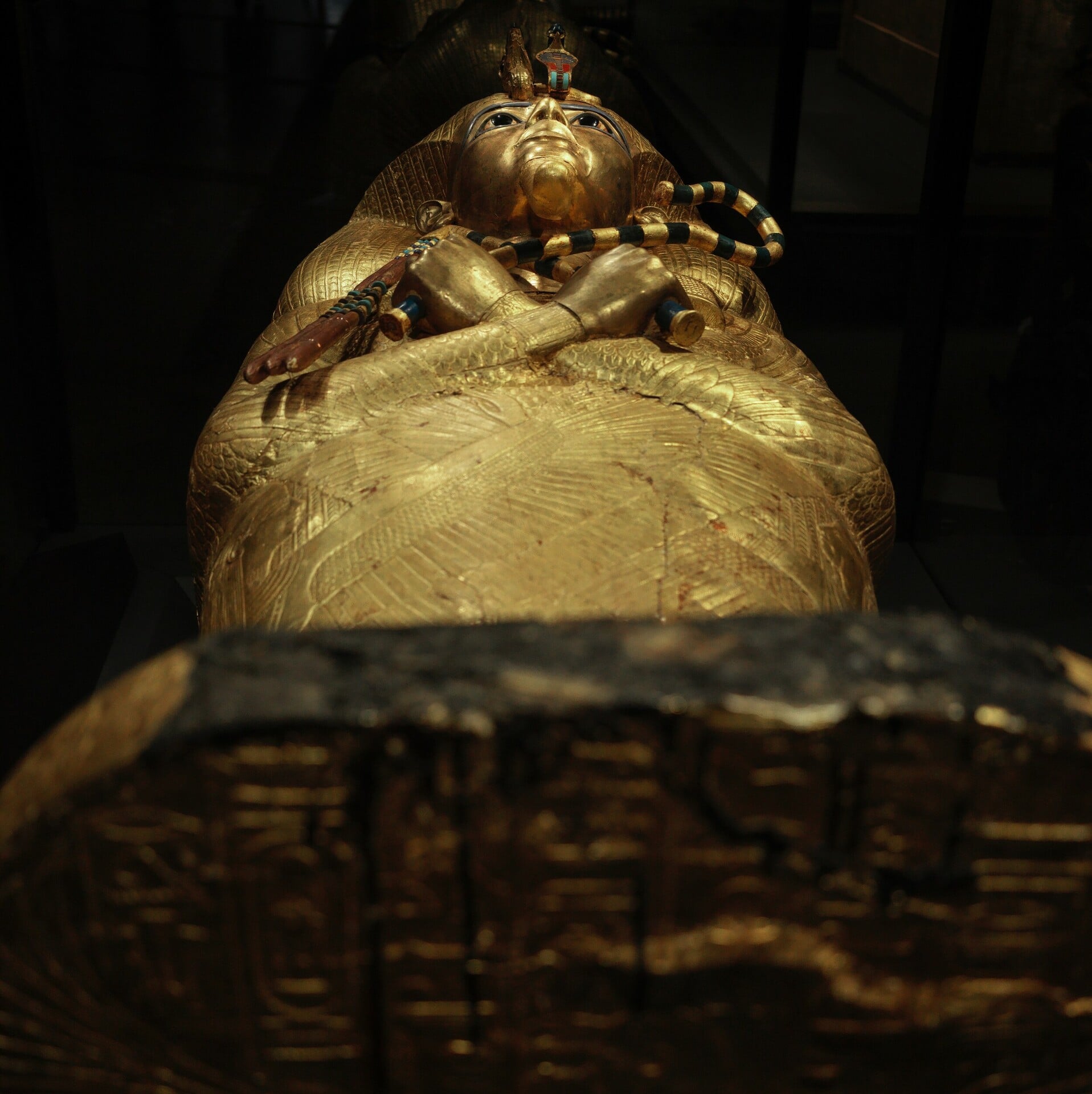Όταν ο Carter άνοιξε τον τάφο, η σαρκοφάγος αυτή ήταν καλυμμένη με μια μαύρη, κολλώδη ρητίνη που είχε χυθεί κατά τη διάρκεια του ενταφιασμού. Οι συντηρητές του GEM πέρασαν χρόνια καθαρίζοντας προσεκτικά αυτή την ύλη για να αποκαλυφθεί η λάμψη του χρυσού και τα χρώματα του λάπις λάζουλι που βλέπουμε σήμερα.