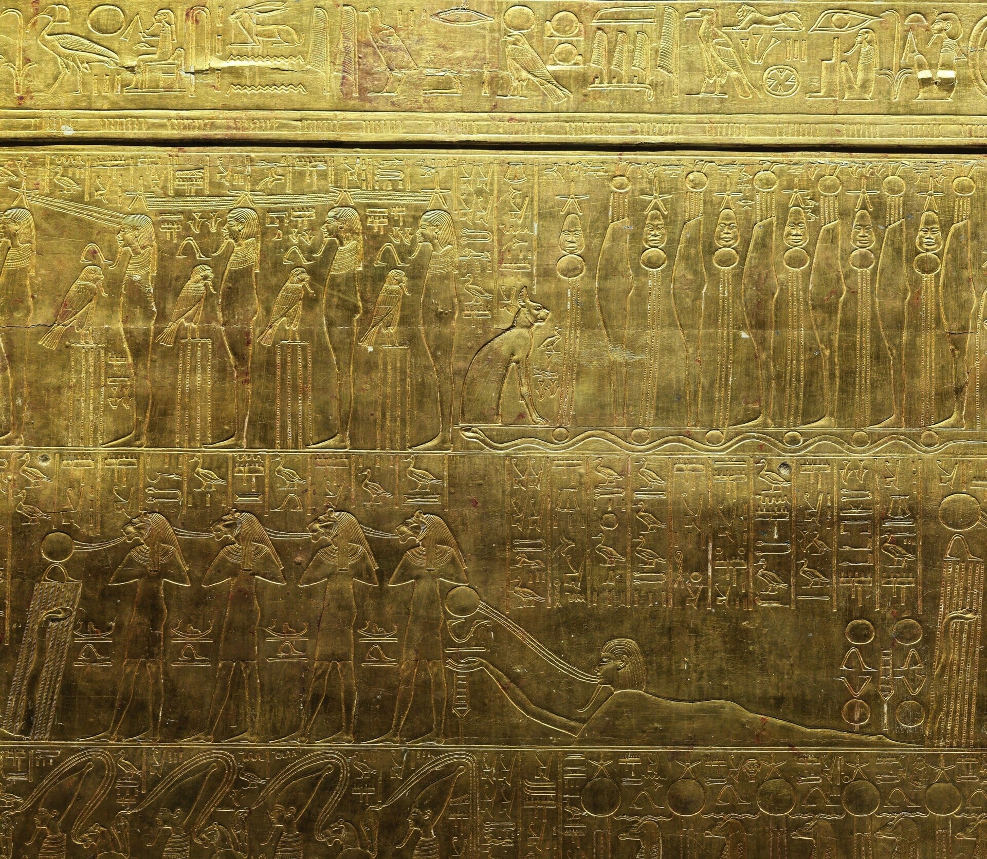 Ανάγλυφα κείμενα και εικόνες από το «Βιβλίο των Πυλών» ή το «Βιβλίο του Αμντουάτ» πάνω στο ολόχρυσο ιερό που μέσα του εναπόθεσαν τη βασιλική μούμια. Περιγράφουν το ταξίδι του θεού Ήλιου μέσα στο σκοτάδι της νύχτας, μέχρι ο Τουταγχαμών να γίνει ένα με τον Ήλιο, ώστε να «ανατέλλει» κάθε πρωί αιωνίως, διατηρώντας το Ankh του, τη ζωούλα του.