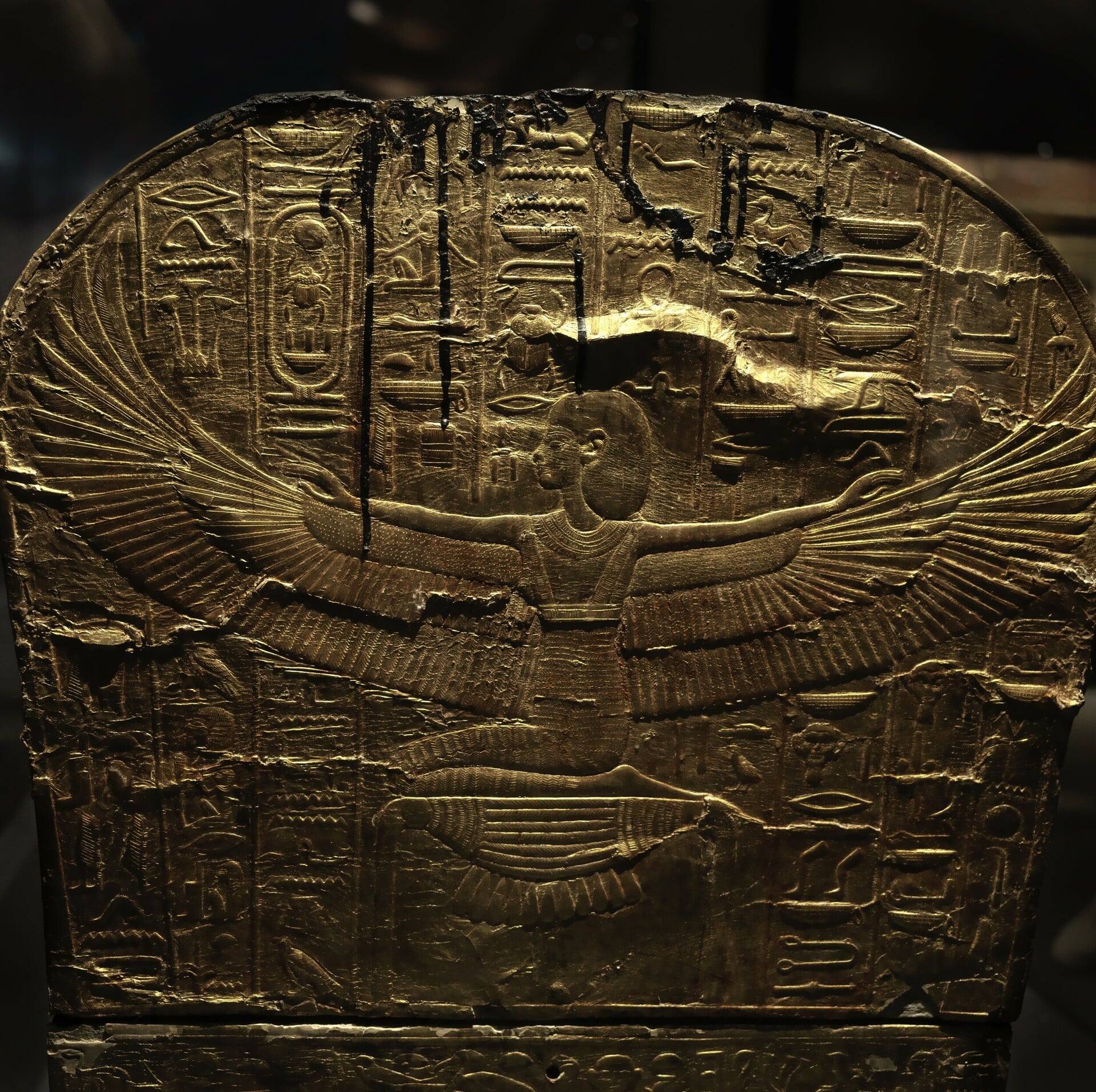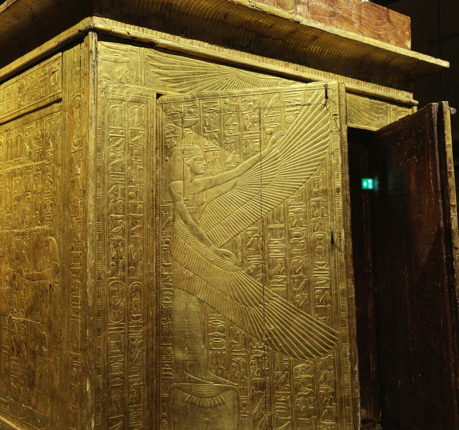 Φύλλα χρυσού πάνω σε ξύλο κέδρου για το κιβώτιο που μέσα του θα έμπαινε η σαρκοφάγος. Η θεά Ίσις απλώνει την προστατευτική φτερούγα της πάνω στον νεκρό βασιλιά. Διακρίνονται οι προσευχές από το «Βιβλίο των Νεκρών». Στην αρχαία αιγυπτιακή πίστη, τα φτερά των θεοτήτων δημιουργούσαν έναν «θείο άνεμο» που έδινε πνοή ζωής στον νεκρό για το ταξίδι του στην αιωνιότητα. Επίσης, πιστευόταν ότι το δέρμα των θεών είναι φτιαγμένο από καθαρό χρυσάφι. Λογικό.